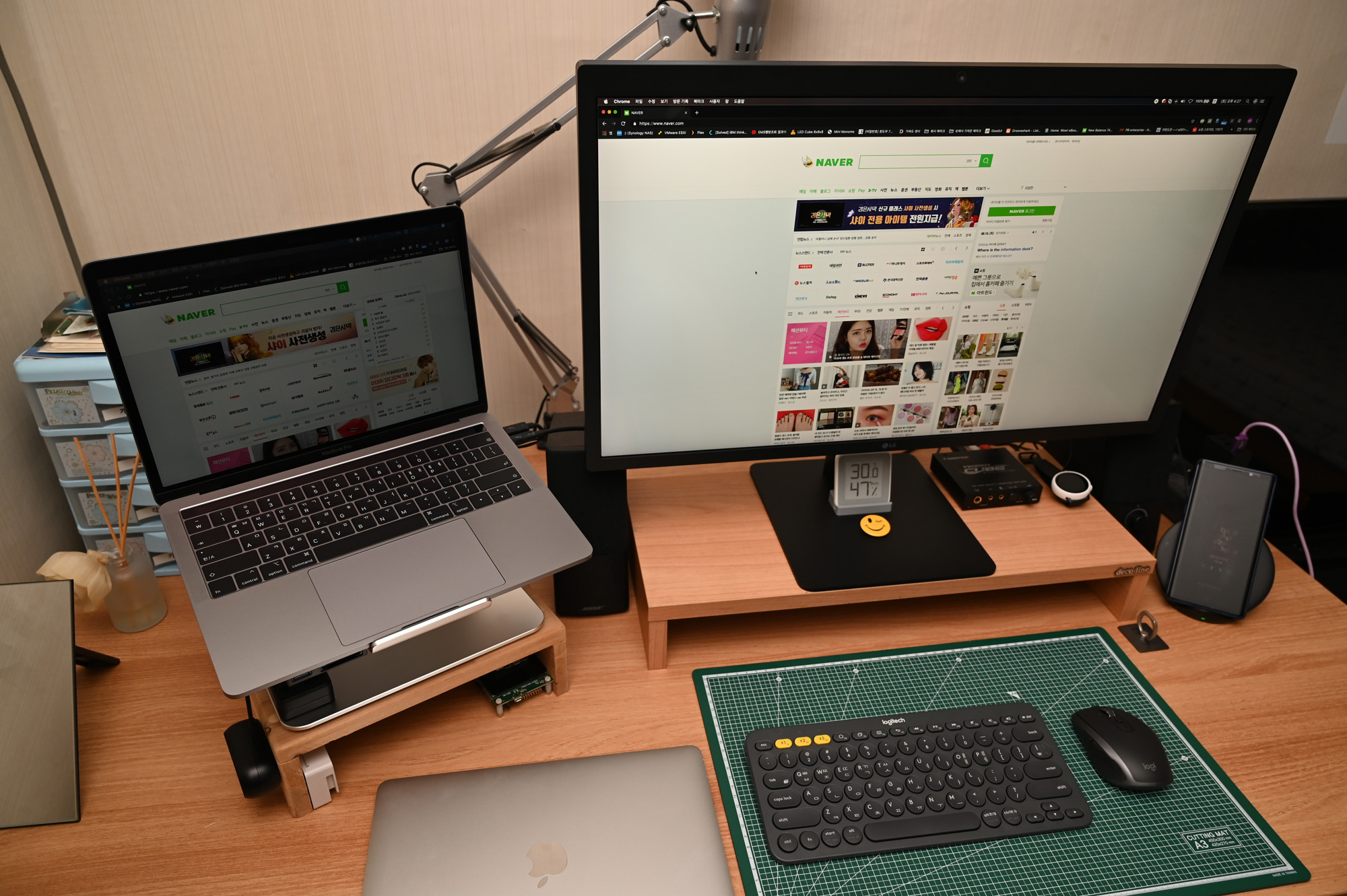 지금(2019년 7월 7일)은 맥북 프로를 팔아버리고 자리 잡은 2018년형 맥 미니 고급형(i5/16GB/256GB)과 연결시켜 놨습니다.