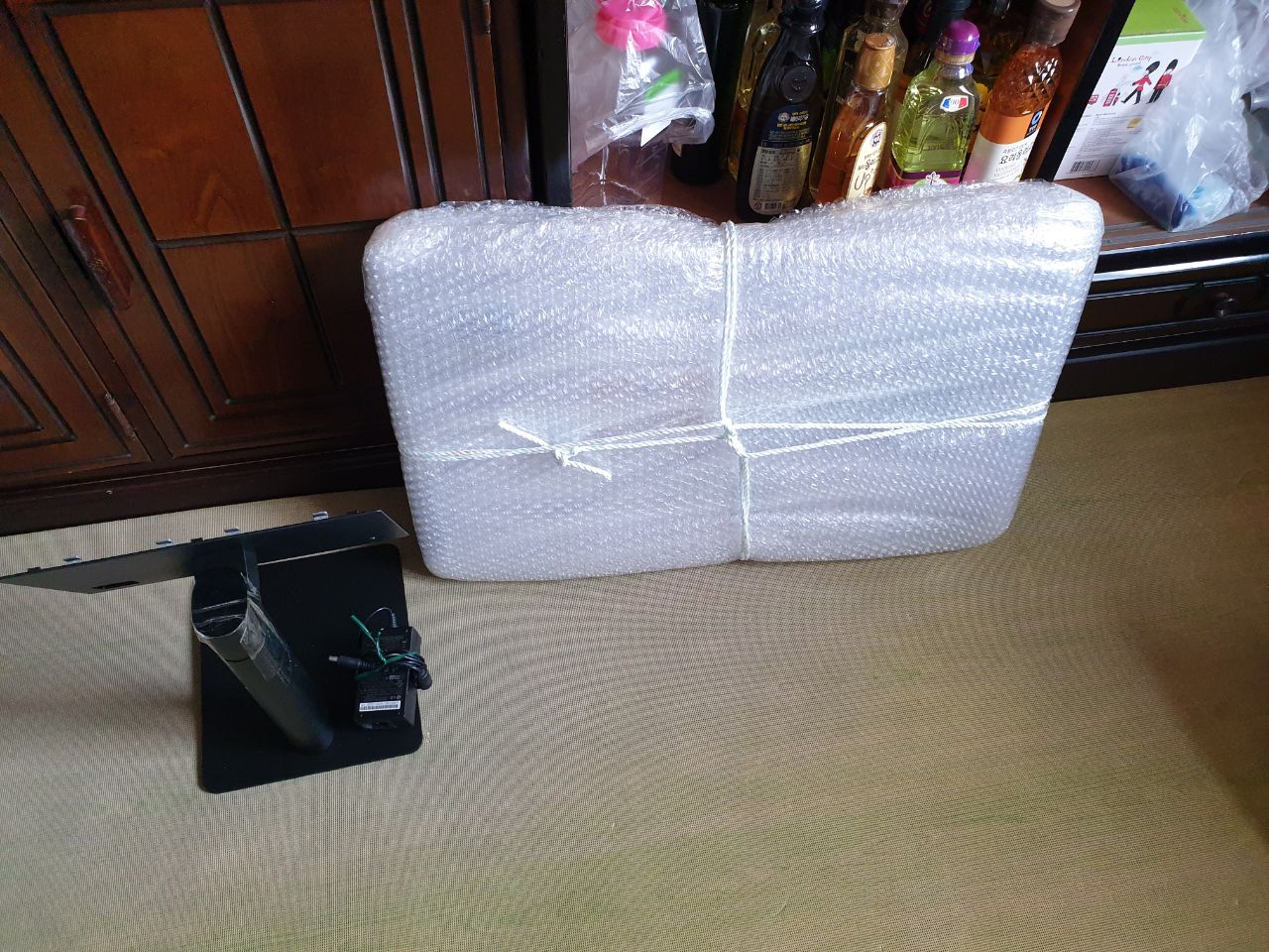 이번에 본가 내려왔을땐 자차를 끌고 오지 않고 고속버스를 타고 왔습니다. 그래서 이 모니터를 들고 가는것이 매우 큰 일이었습니다. 그래서 위 사진처럼 스탠드와 분리한 후 액정부를 완충제로 감쌌습니다. 그리고 노끈으로 손잡이를 만들었습니다. 생각보다 매우! 만족스러웠습니다. 스탠드는 택배로 받기로 했습니다. 액정부만 있으면 동작 테스트는 가능하니까요.