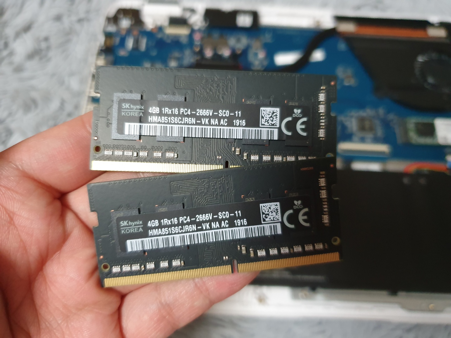 그리고 램을 교체합니다. 기존에 설치되어 있던 램과 동일한 사양인 DDR4-2666V 입니다. 맥미니 2018의 램 업그레이드 후 남아서 보관만 하던 부품이었는데, 기존의 램을 제거하고 깔맞춤 할 겸 해서 이 녀석 두개를 넣어줍니다.