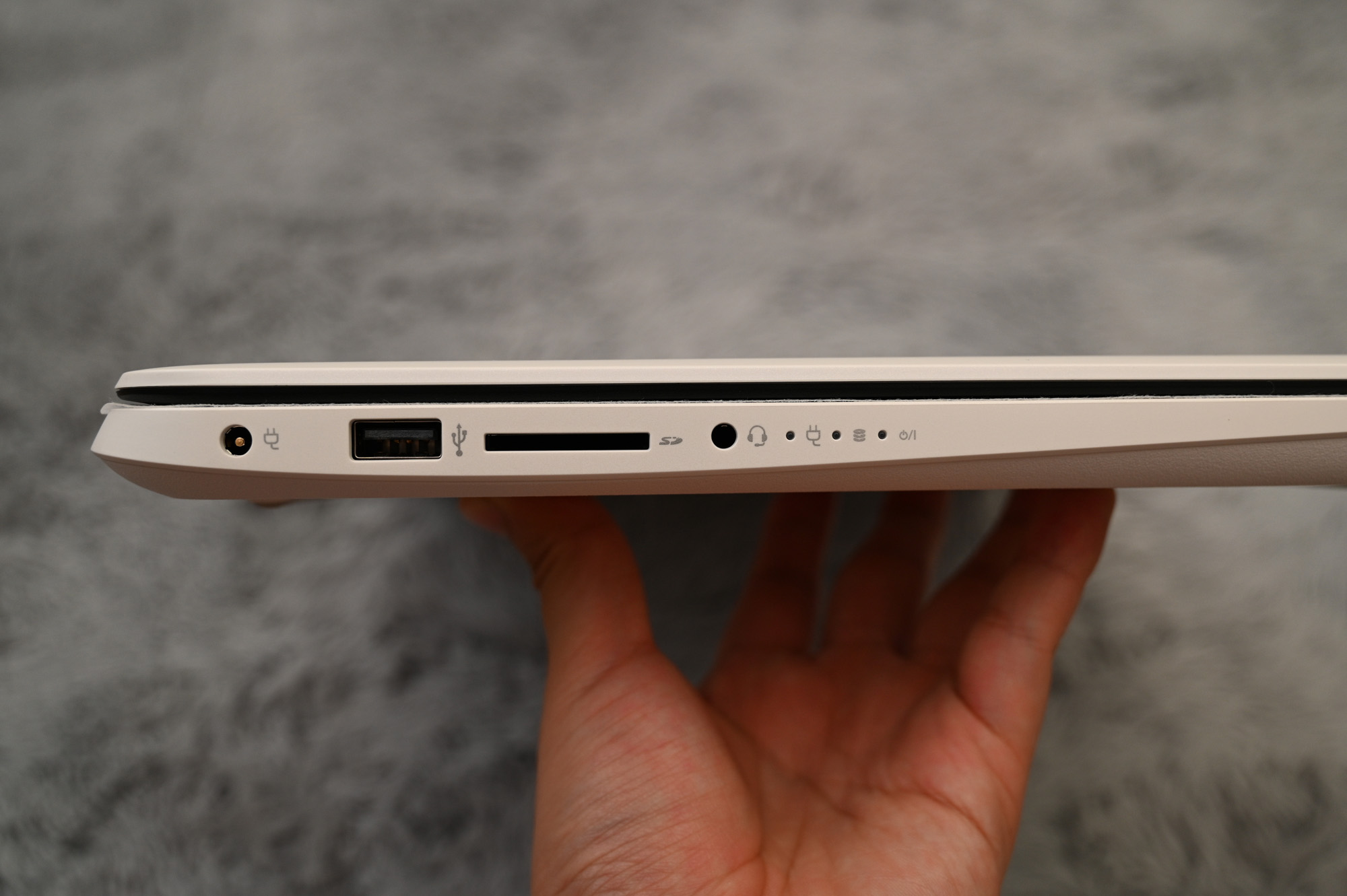 노트북의 좌측에는 전원 단자, USB 2.0 포트 1개, SD 카드 슬롯 1개, 이어폰 단자 1개 및 상태 LED 3개가 있습니다. LED는 좌측부터 전원 입력, 디스크 사용 상태, 전원 켜짐 상태 입니다.
