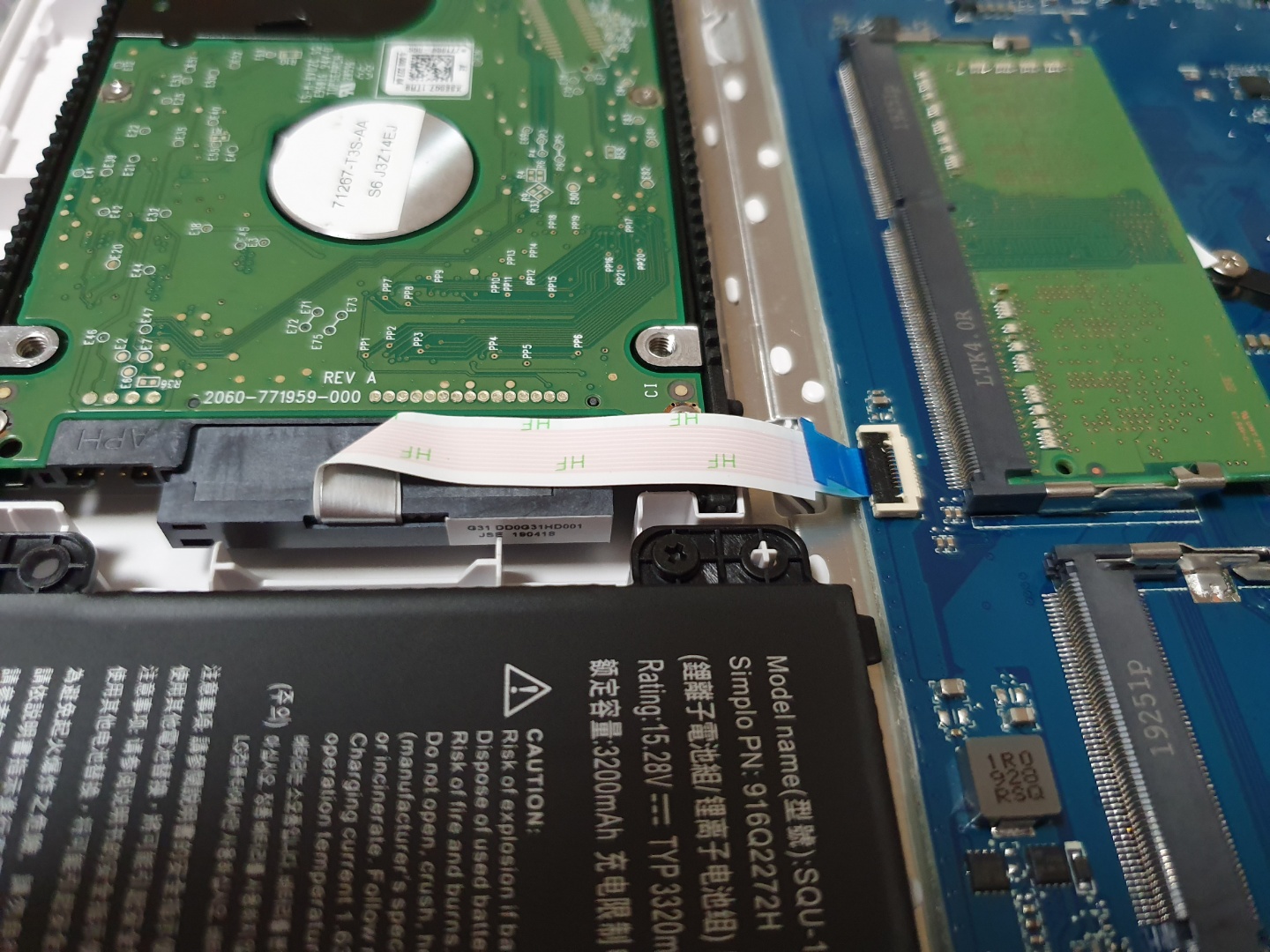 집에 굴러다니던 WD Blue 320GB 하드디스크를 달아줍니다. 2.5인치 드라이브 가이드 및 SATA+전원 케이블은 같이 동봉되어 있으니 잘 찾아봅니다. 그리고 사진처럼 잘 연결해줍니다.