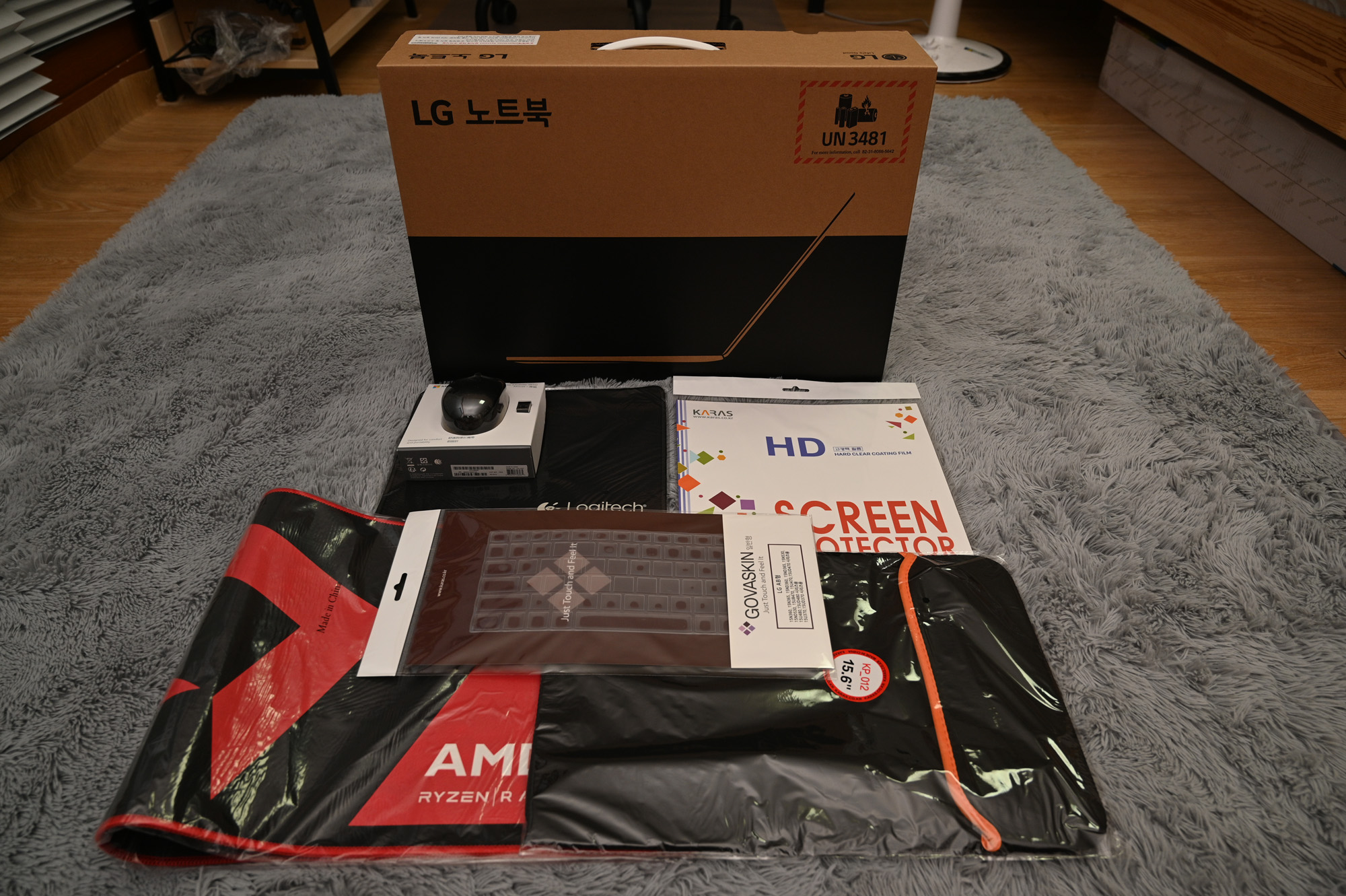 뭐가 엄청나게 많이 따라왔습니다. 무선 마우스, 마우스 패드, 액정 보호필름, 키보드 스킨, AMD 장패드 그리고 15.6인치용 노트북 파우치 입니다.