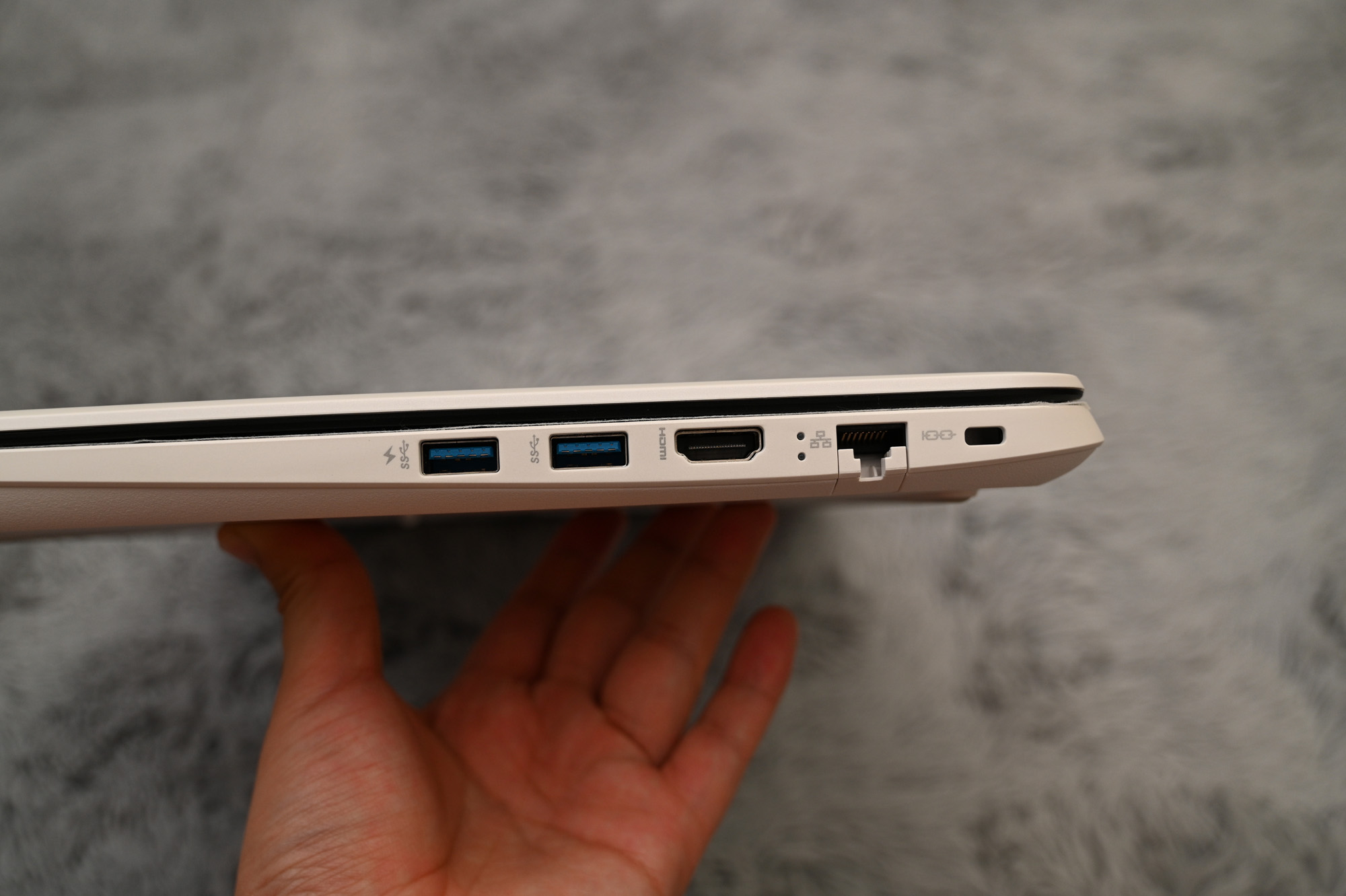 노트북의 우측에는 USB 3.0 포트 2개, HDMI 포트 1개, 기가비트 이더넷 포트 1개 및 캔싱턴 락 홀이 있습니다. 맨 좌측에 위치한 USB 3.0 포트에는 번개 마크가 있습니다. 노트북 전원이 꺼져있어도 해당 포트로 휴대용 장치의 충전이 가능하다는 의미입니다.