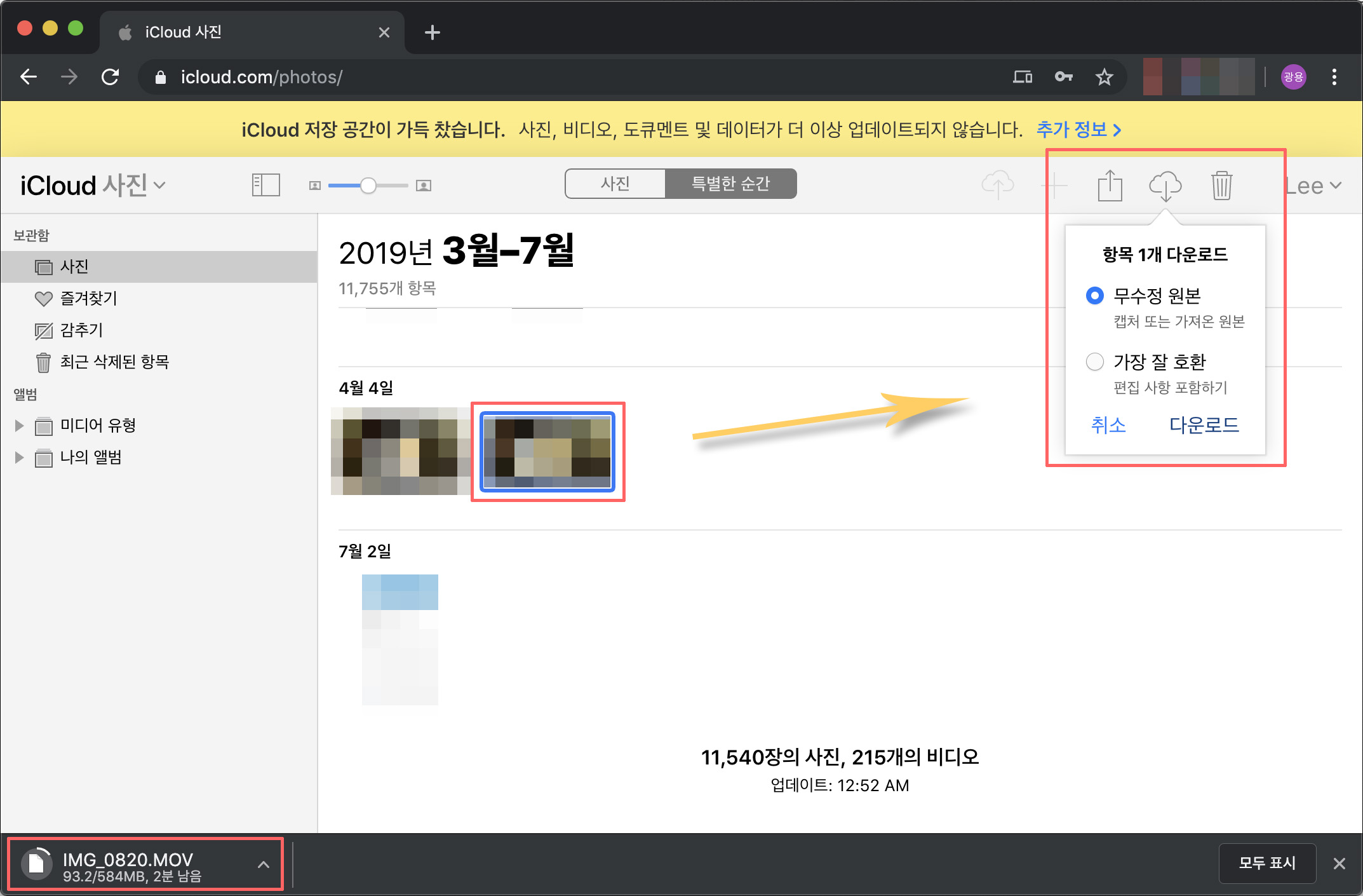 다운로드 받고 싶은 사진 또는 동영상을 선택한 후 우측 상단의 다운로드 아이콘(아래쪽 방향 화살표가 있는 구름 아이콘)을 클릭합니다. 다운로드 아이콘을 자세히 보시면, 아이콘의 우측 하단에 v 모양이 있습니다. 그 아이콘을 클릭하면 상세 메뉴가 나오니 원하는 설정으로 다운로드 받으면 됩니다.