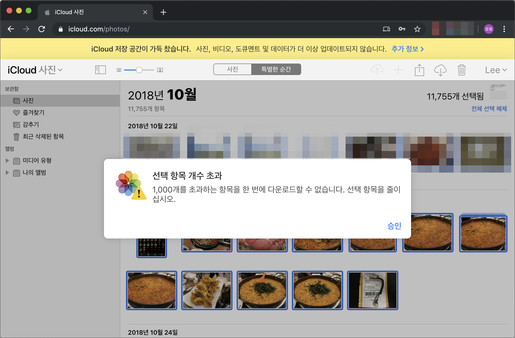 11,000개가 넘는 사진을 한번에 다운로드 받아야지~ 하고 전체 선택한 후 다운로드 버튼을 누르면? 또 문제가 생깁니다. 1,000개를 초과하는 항목을 동시에 다운로드 할 수 없다고 합니다.