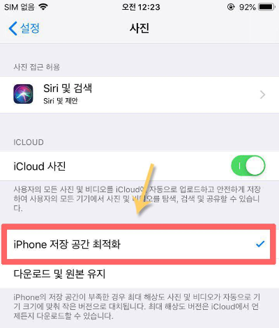 그래서 용량 확보를 위해 아끼고 아껴뒀던 방법을 사용 했습니다. "설정 -> 사진"에 있는 '저장 공간 최적화' 옵션입니다.