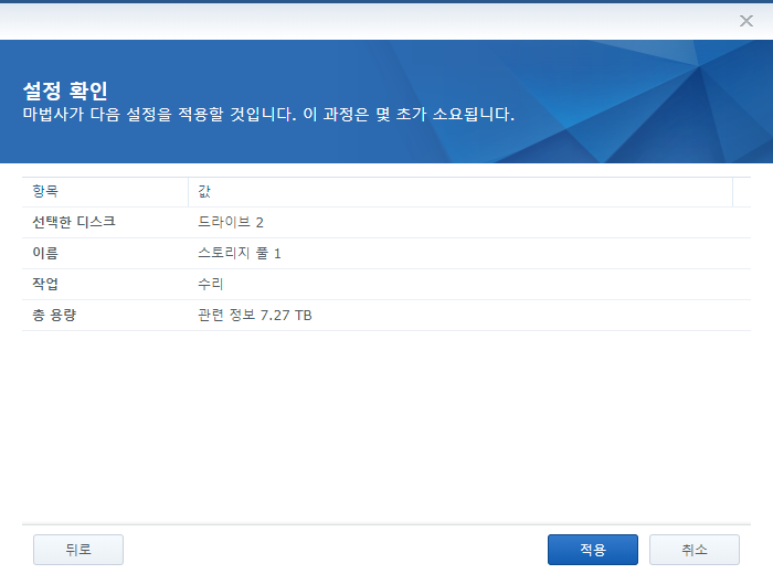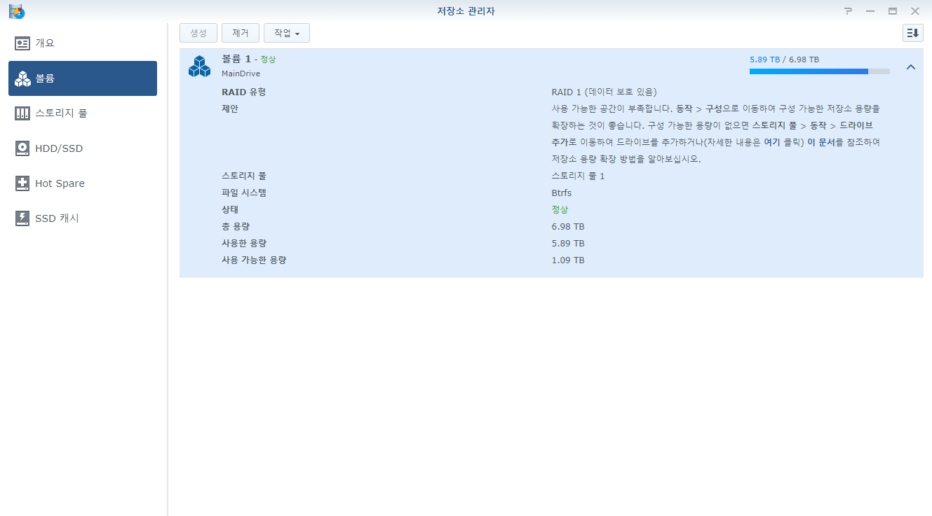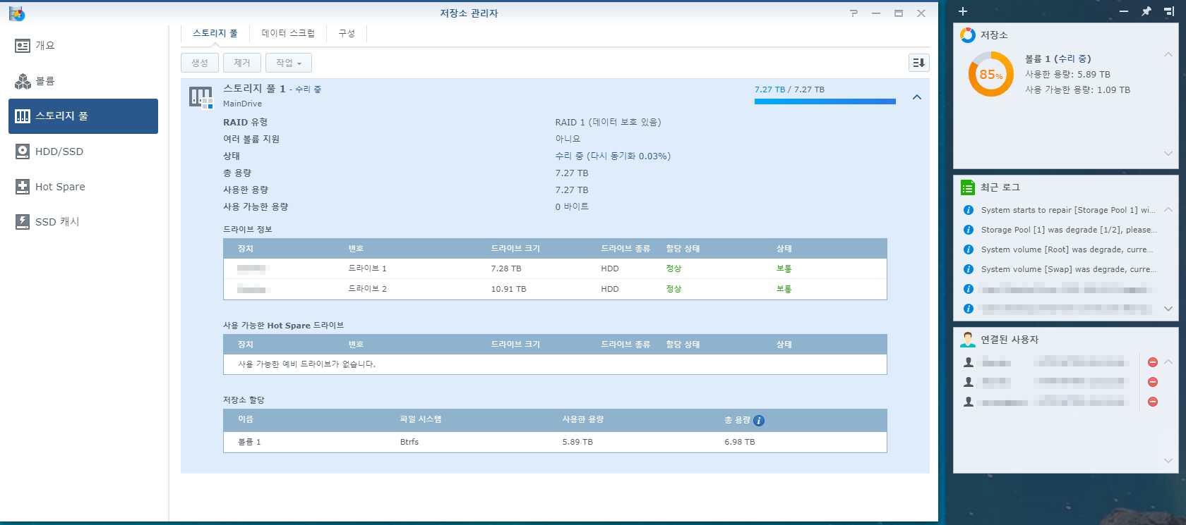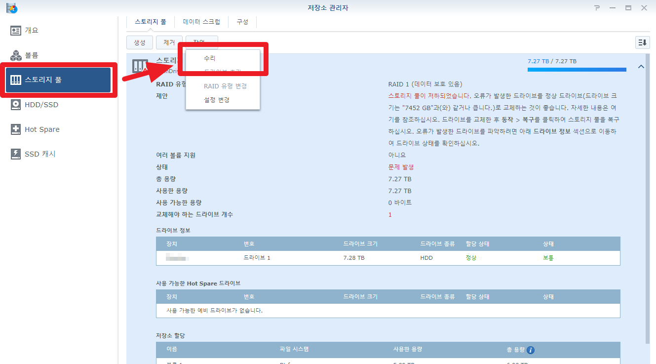 Disk Station의 저장소 관리자에서 스토리지 풀을 선택하면 '수리'를 진행할 수 있습니다. 기존 RAID1 구성으로 잘 돌아가다가 디스크 1개가 제거된 상황이기 때문에 동일 용량 또는 더 큰 용량의 하드디스크를 장착한 후 수리를 진행해야 합니다.