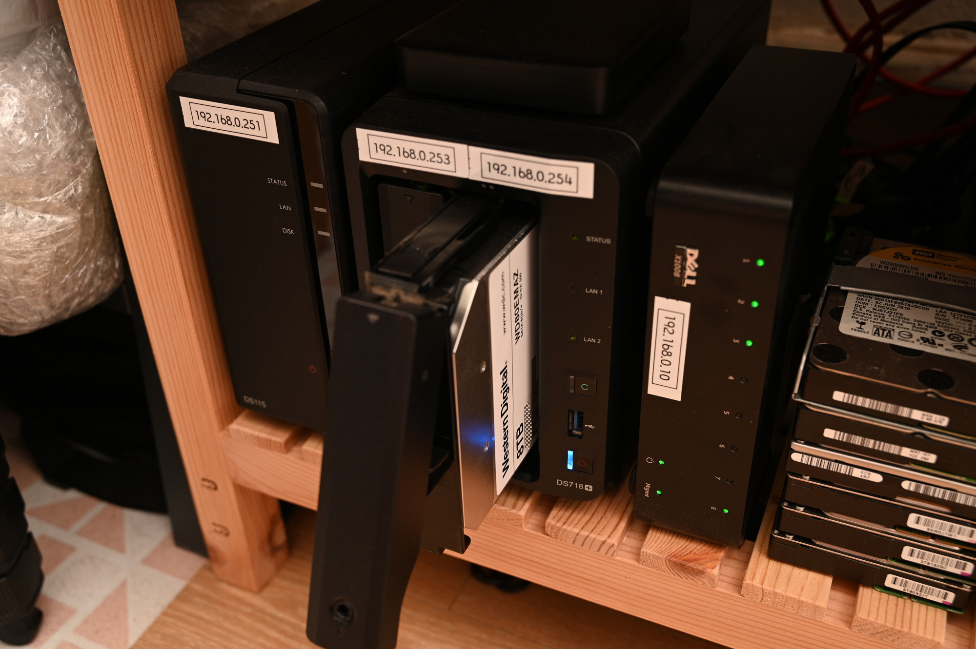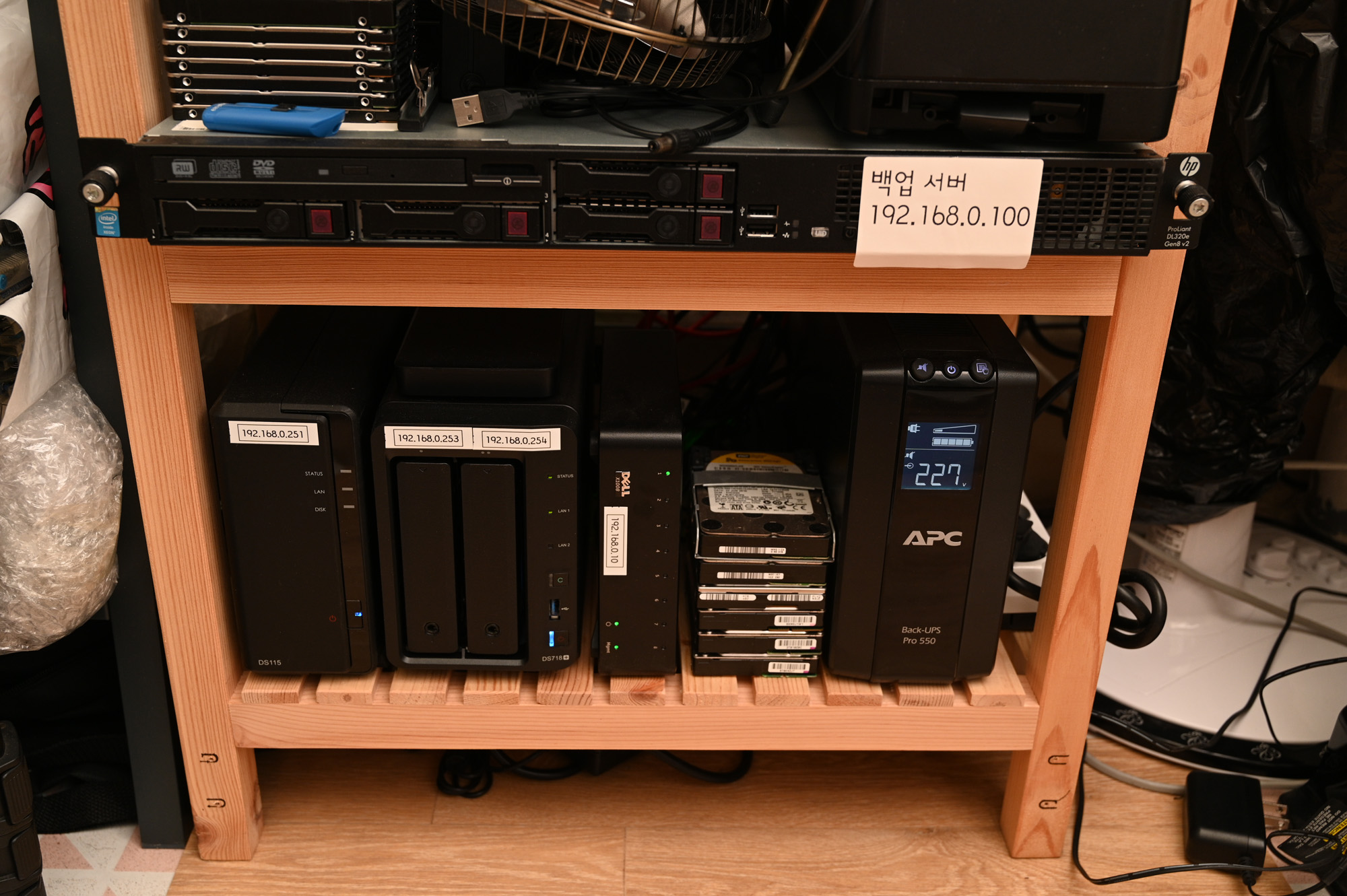 좌측부터 시놀로지 DS115(백업 전용), DS718+(메인 서버), 델 X1004 스위칭 허브, 하드디스크 무리들(?), APC UPS 입니다. UPS를 들여놓으면 참 좋은게.. 평일에 저도 모르게 아주아주 가끔씩 정전이 되나 봅니다. 퇴근하고 APC의 LCD 창을 보면 이벤트 숫자가 1개씩 올라가있더라구요. 잘 돌아가는것을 보면 UPS 돈 아깝지 않네요.