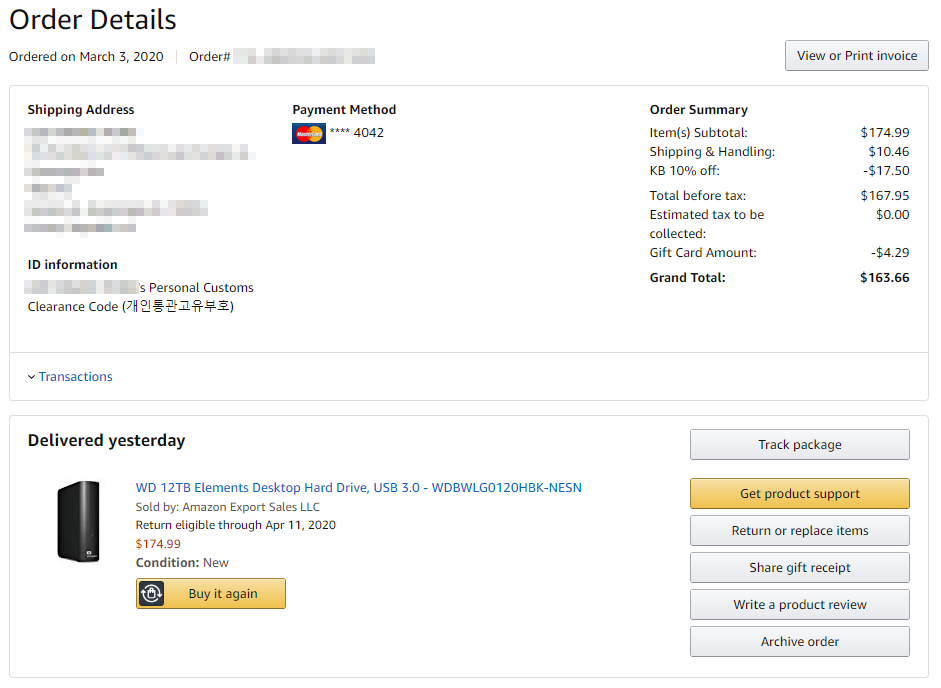 국내 직배도 가능했던터라 배송비 10.46달러가 들었습니다. 하드디스크 같이 충격에도 약하고 혹시 모를 위험성이 있는 제품은 국내 직배로 구입하는 것이 나중에 사후처리 할때 매우 편리합니다. 174.99달러에서 KB10 프로모션 코드로 17.5달러 할인, 여기에 배송비 10.46달러가 포함되어 실제 구매 금액은 167.95달러 입니다. 한화로 약 20만원이 조금 넘는 수준입니다. 지금 환율이 거의 1,200원이라.. 환율 너무 높습니다 ㅠㅠ