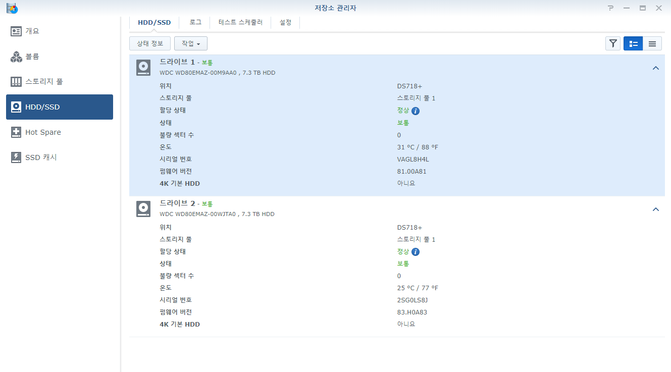 현재 제가 사용 중인 시놀로지 DS718+는 WD 8TB 하드디스크 2개가 들어있으며 RAID 1으로 구성되어 있습니다. 그리고 DS115으로 매일 한번씩 새벽시간대에 Hyper Backup으로 증분 백업 하고 있습니다.