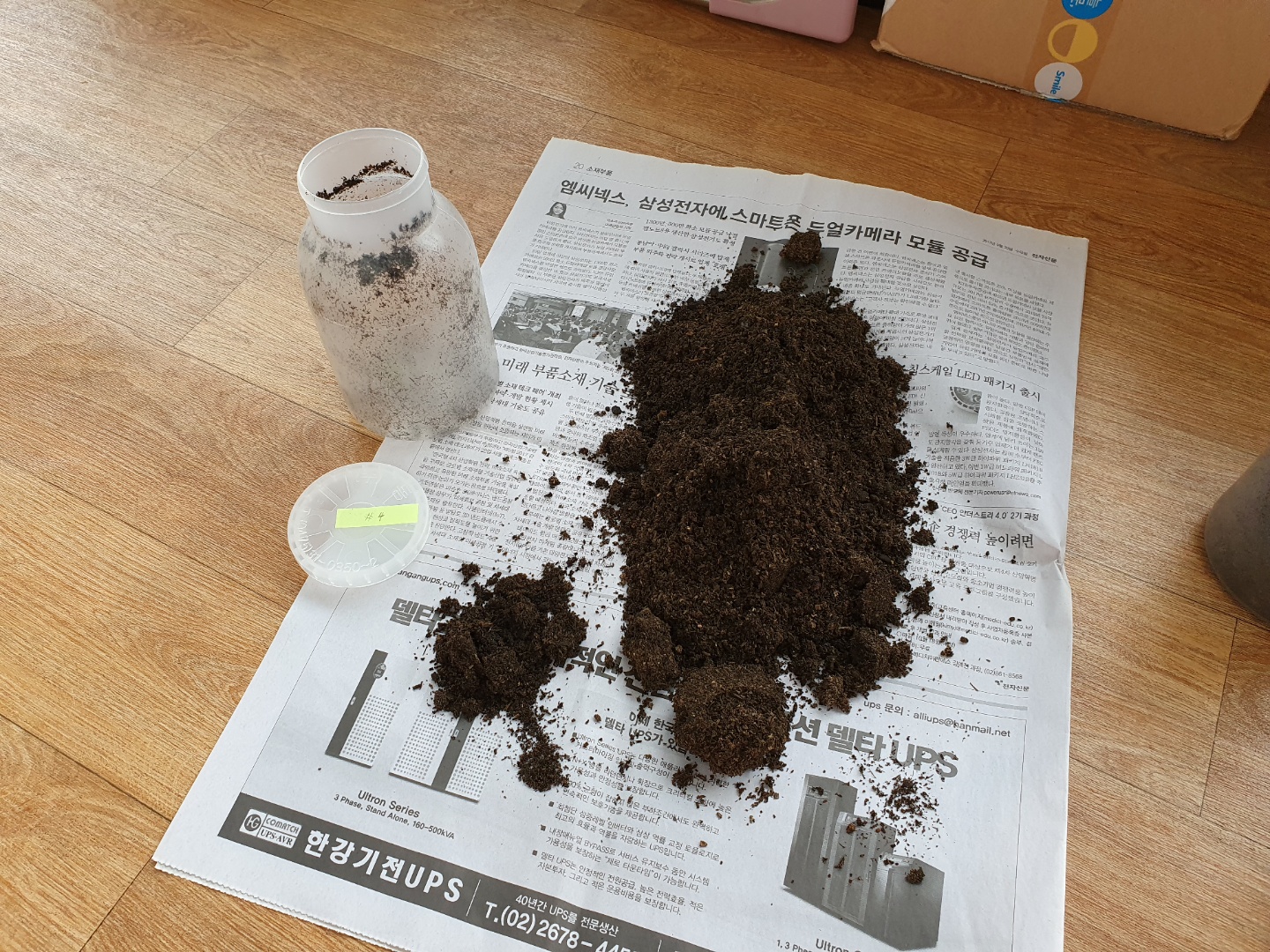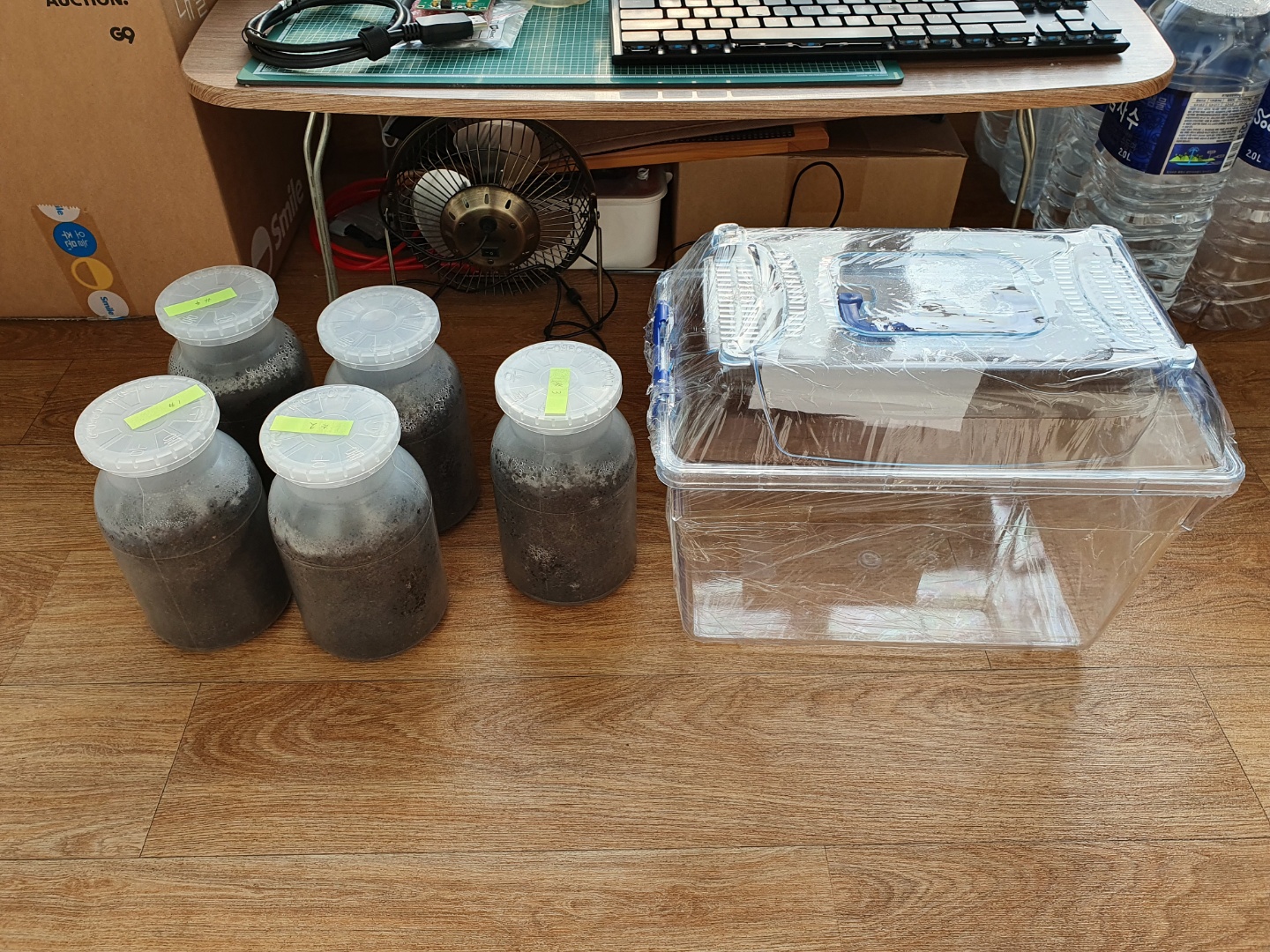 좌측엔 사육통 5개, 우측엔 쿠팡에서 약 5,000원에 주문한 채집통 입니다. 무료배송으로 샀으니 가성비 아주 그냥 끝장납니다. 이 시점에서 안타까운 소식이라면.. 5마리 중에서 한 마리는 세상을 떠났습니다. 다른 애들은 무럭무럭 자라나는데 이 녀석 혼자 계속 작은 상태였고, 장수풍뎅이 애벌레들은 흙속에서 거의 나오지 않지만, 작은 녀석은 흙 밖으로 나온 상태에서 며칠 동안 흙 속으로 들어가질 못했습니다. 그리고 세상을 떠났습니다..ㅠ