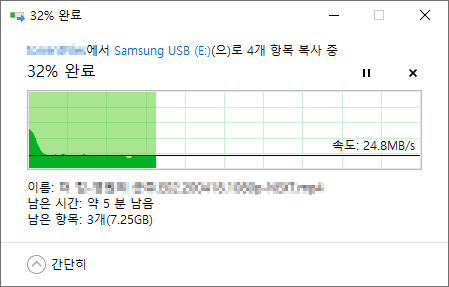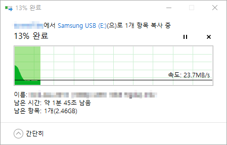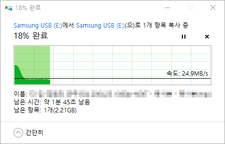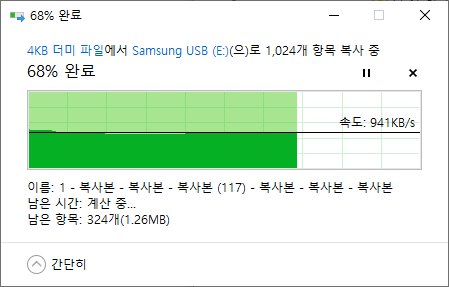 USB 메모리의 남은 공간이 많은 상태에서 파일 읽기/쓰기 테스트를 진행합니다.