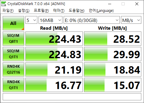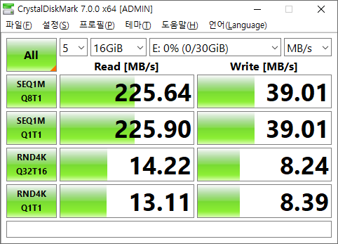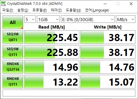- 최대 순차 읽기 속도는 평균 225MB/s를 기록했다.