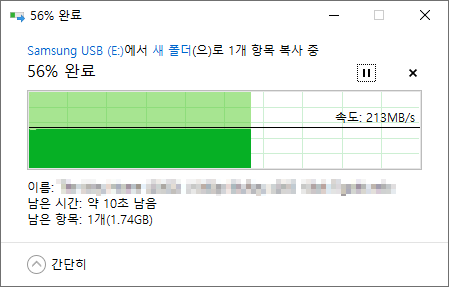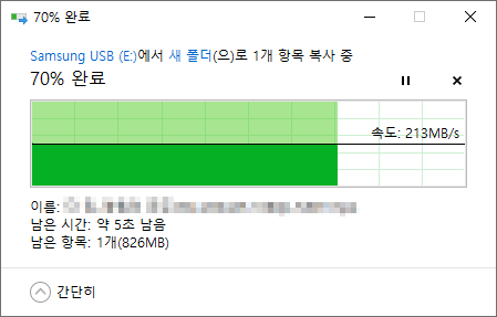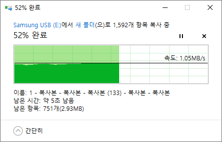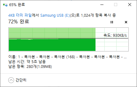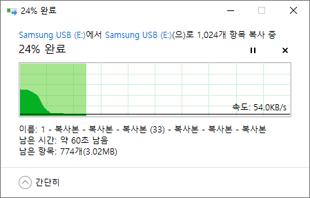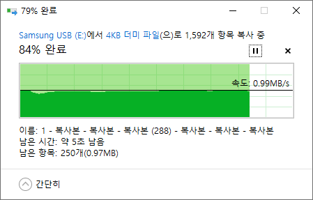 Crystal Disk Mark 의 4KiB 벤치마크 결과보다 훨씬 처참한 결과를 보여줬습니다. 타 드라이브에서 USB 메모리로 복사할땐 평균 930KB/s, USB 메모리에서 읽을땐 평균 1MB/s로 확인되었습니다. 내부 복사시 평균 54KB/s로 확인되었습니다.