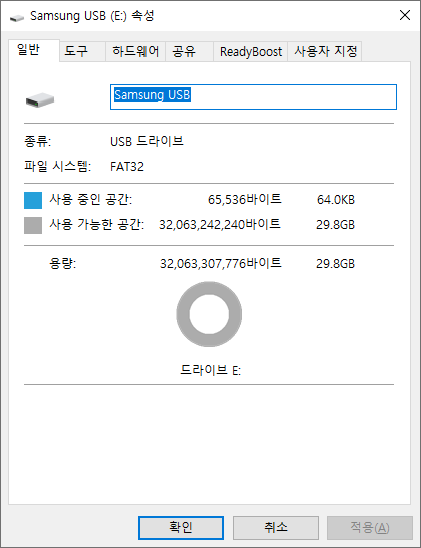 윈도우 인식 용량은 29.8GB 입니다.