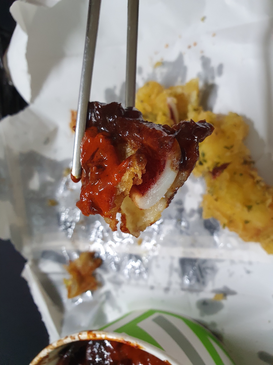 오징어 튀김을 짜장 떡볶이에 찍고 어흥 소스를 올린 후 먹어보니.. 이 세상 맛이 아니네요. 농담이 아니라;; 너무 맛있습니다. 어디 어느곳에서 오징어 튀김을 먹음과 동시에 매콤함과 달콤함, 담백함을 느낄 수 있을까요. 대 만족이었습니다. 배부르게 먹었는데 이게 5천원이라니.. 가성비 너무 좋네요. 마음에 듭니다.