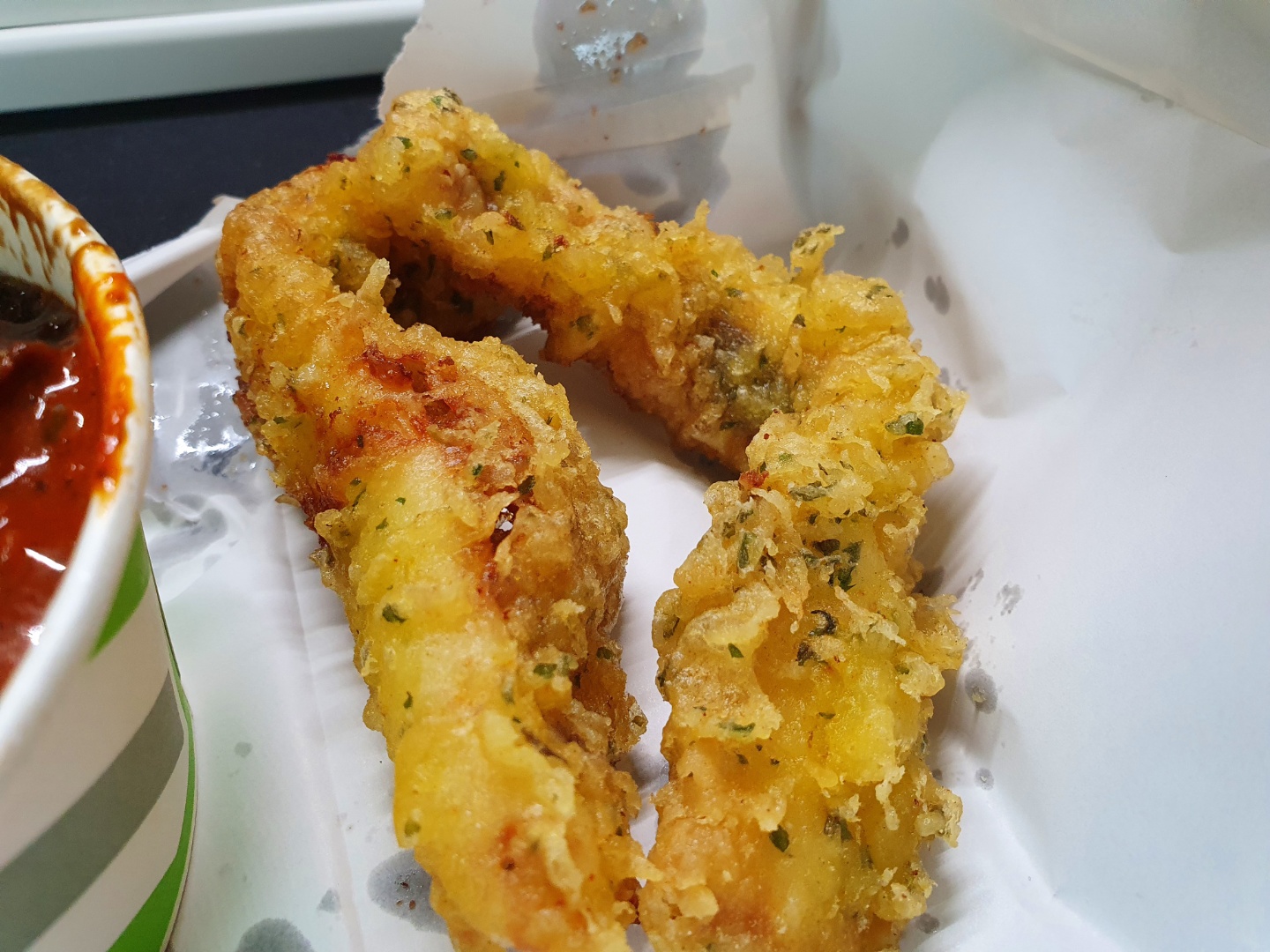 오징어는 몸통만 사용하는 것 같았습니다. 살이 통통하고 부드러워서 먹기 너무 좋았습니다. 튀김 옷이 두껍지 않아 오징어의 부드러움이 배가 되었습니다.