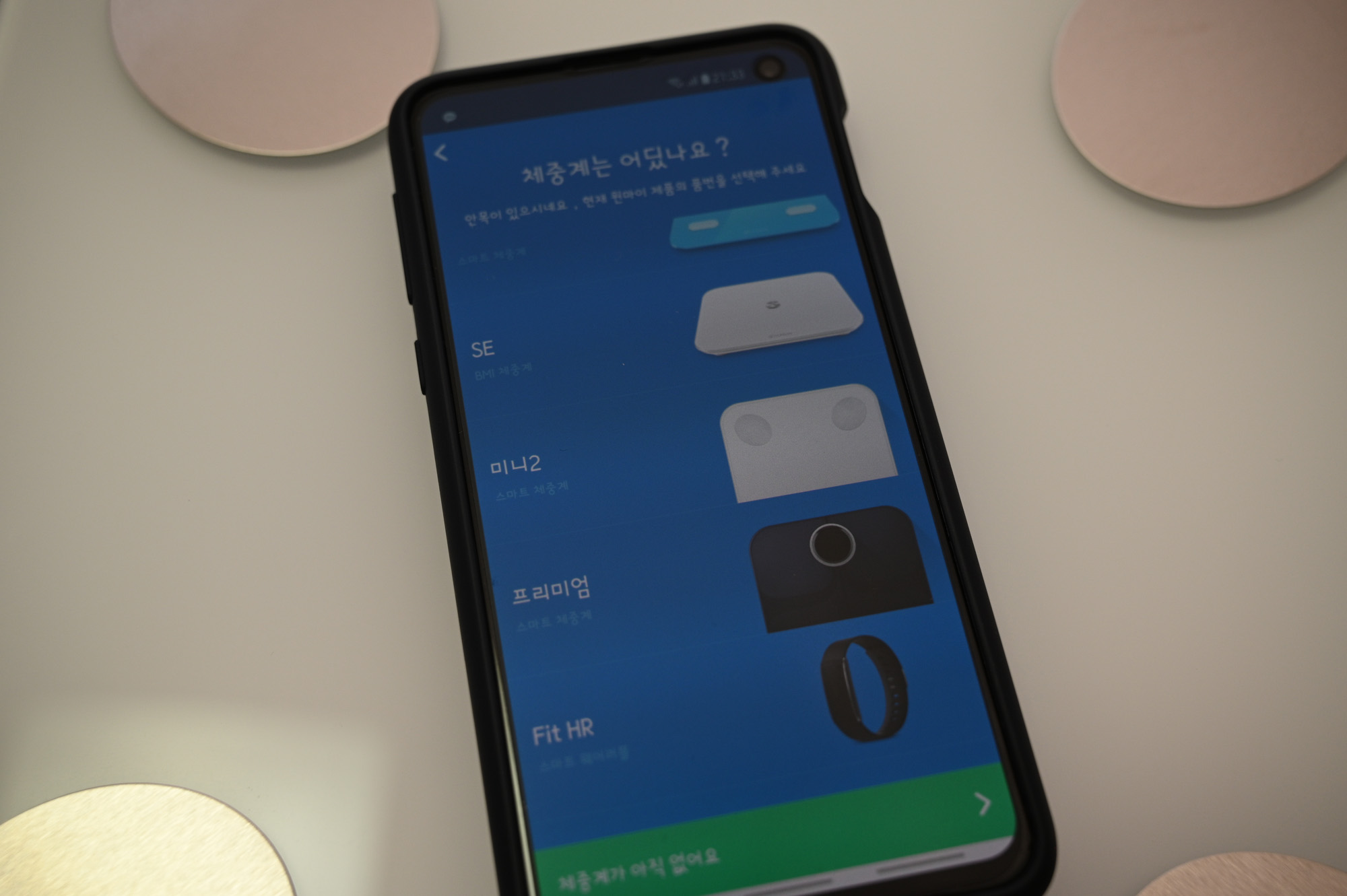 미니2를 선택하고 기다리니까 블루투스로 체중계를 찾았다고 나옵니다. 등록까지 끝냅니다.