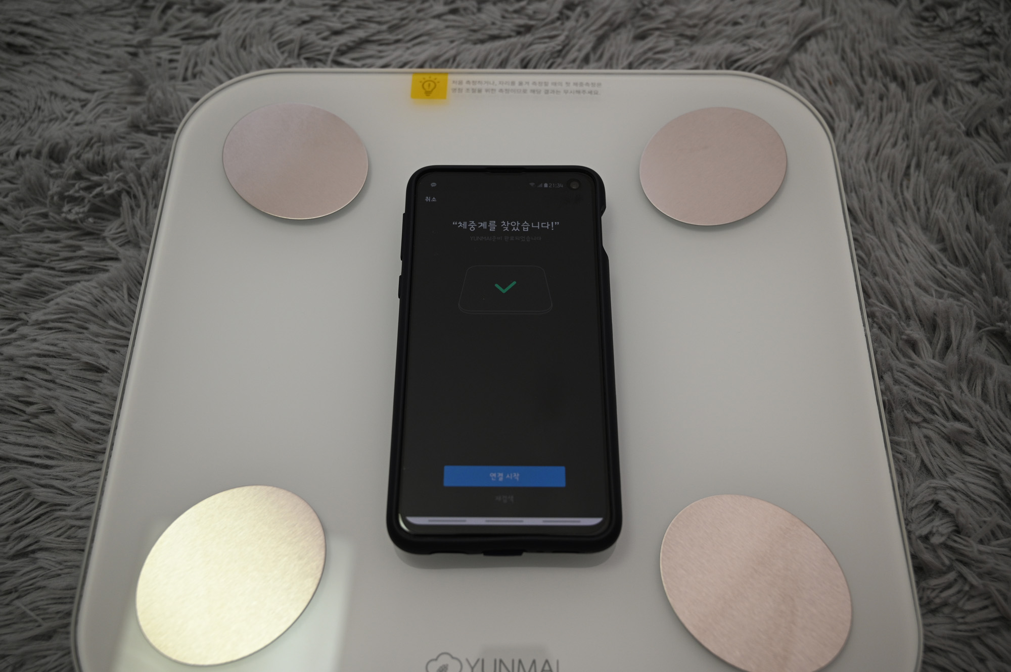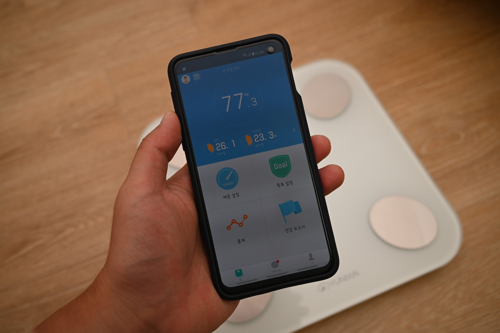 앱을 실행하면 상단에 '연결 완료' 라는 문구가 있습니다. 이 문구가 떠 있는 상태에서 몸무게를 재야지 앱에 기록이 됩니다. 그냥 체중계에 올라간다고 기록되는 것이 아닙니다. 그래서 몸무게를 재기 전에 앱을 실행하고 난 후 '연결 완료' 메시지를 꼭 확인해야 합니다.