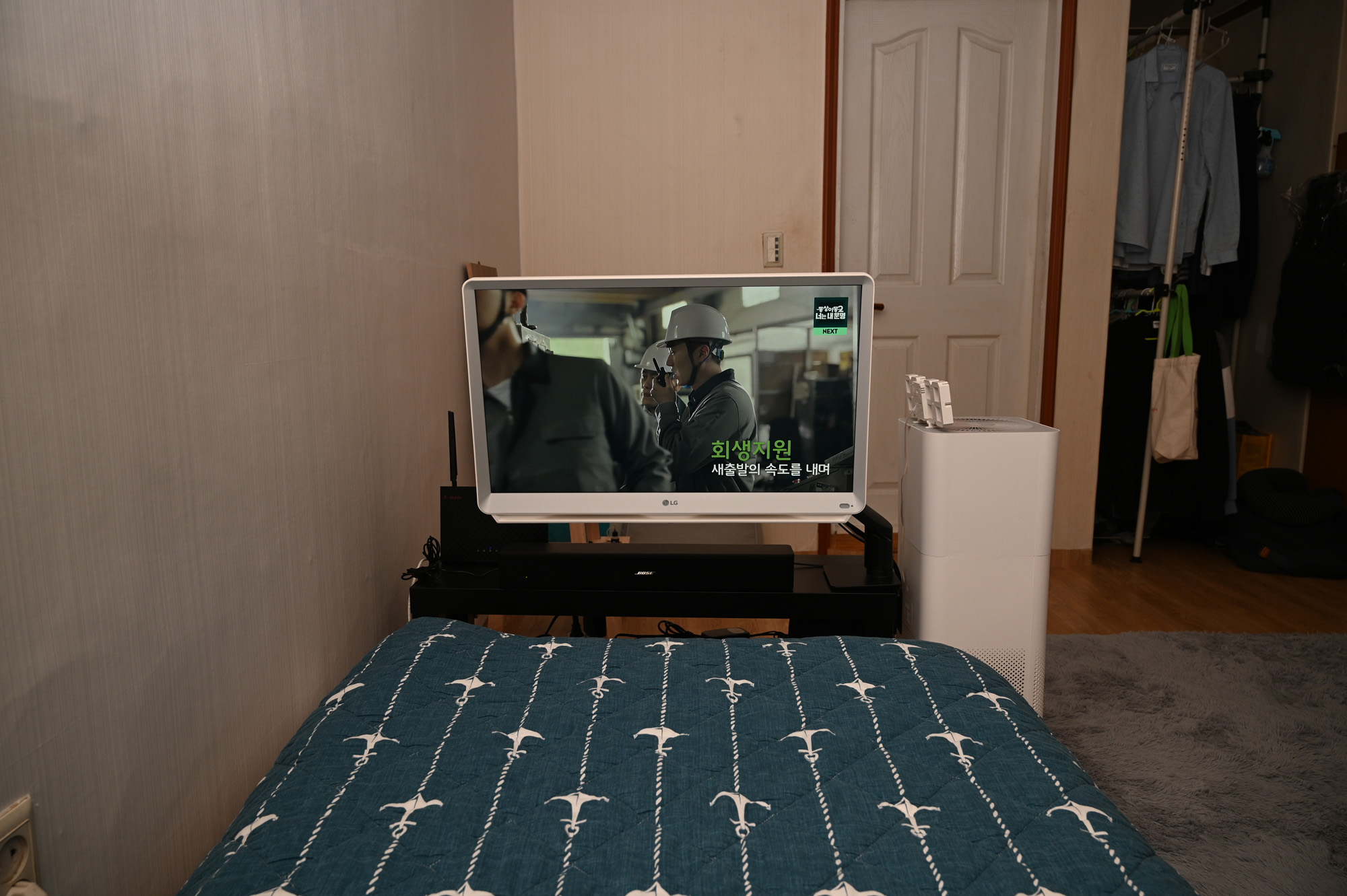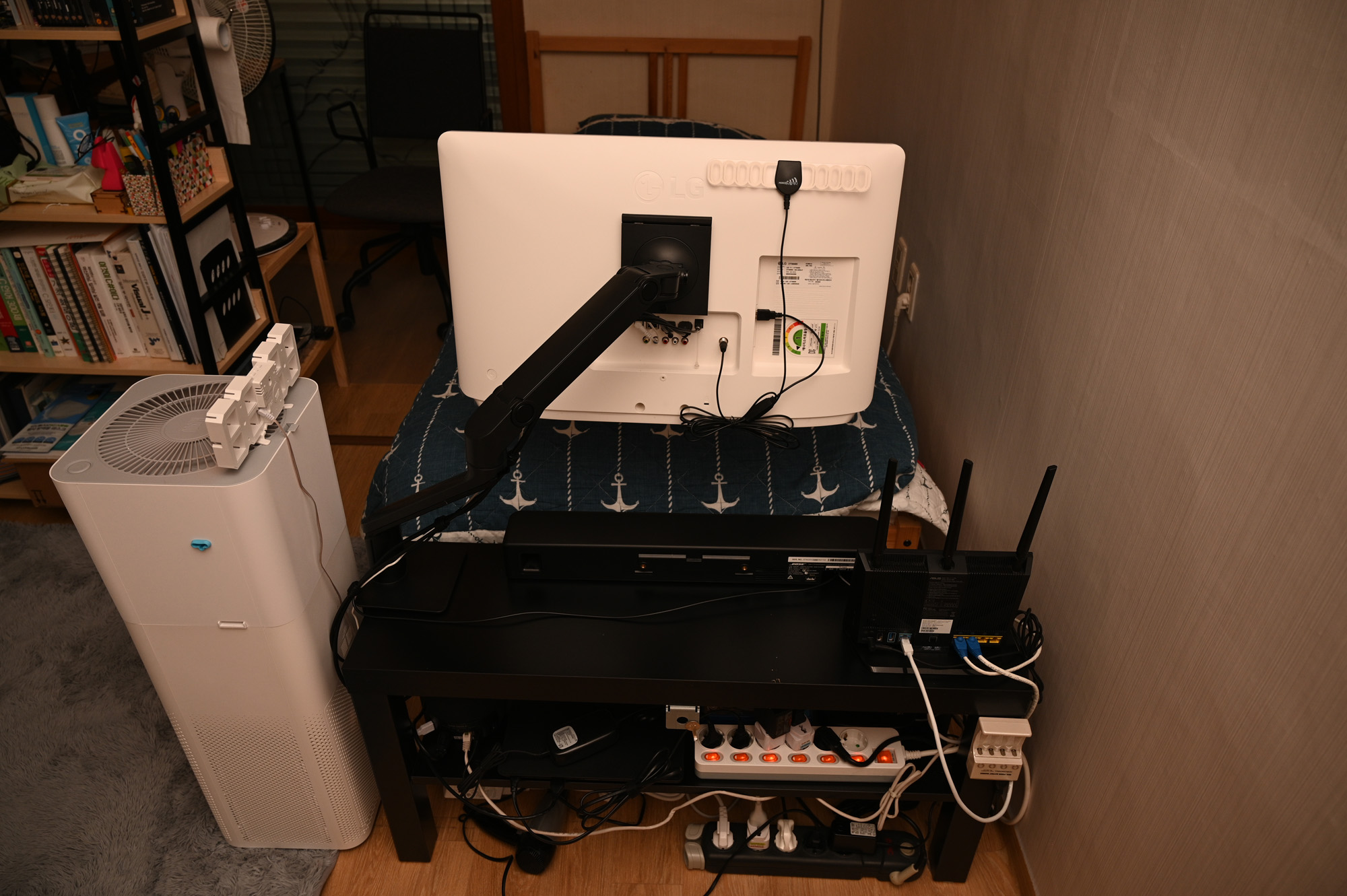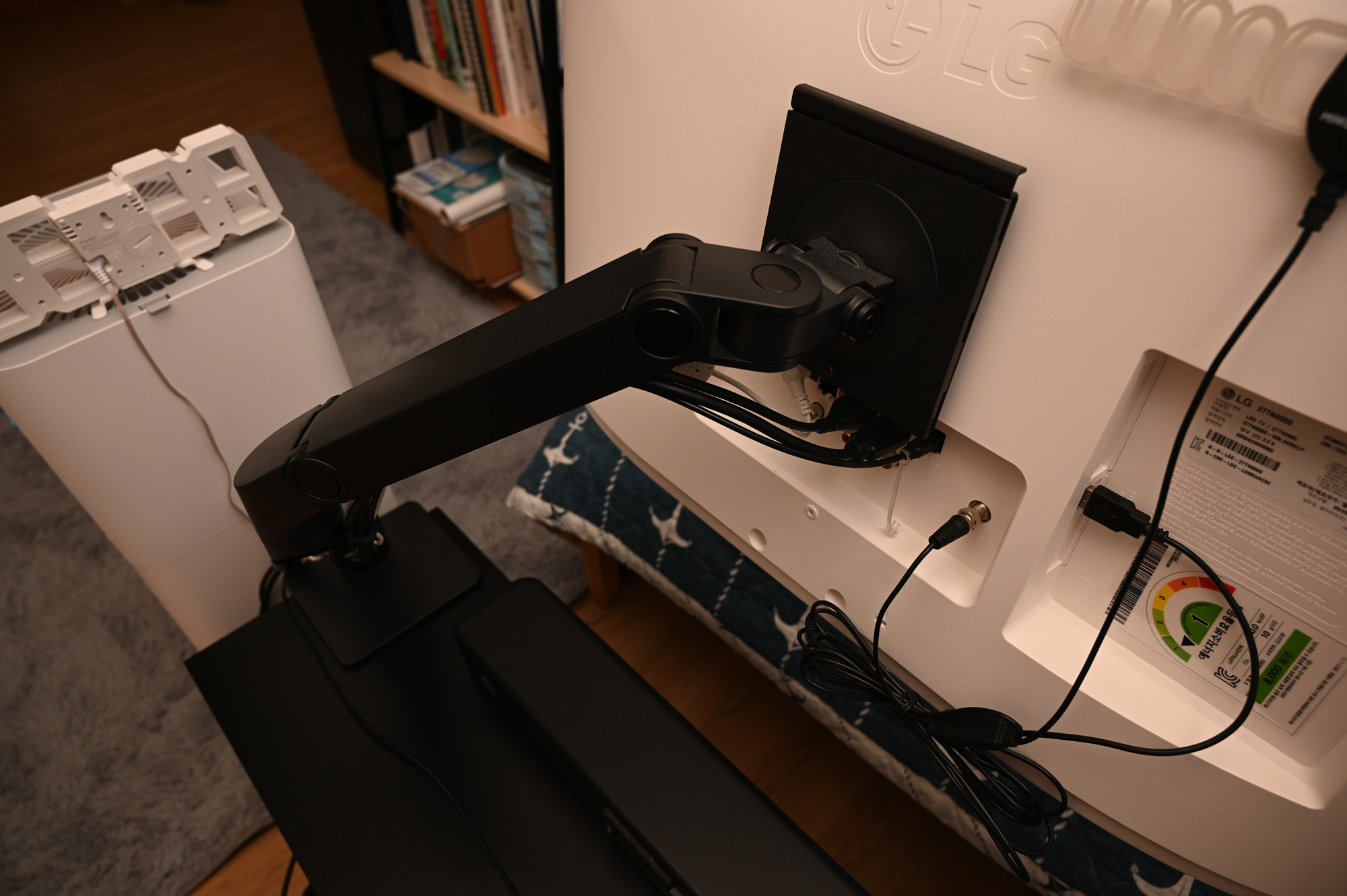 침대의 높이가 TV장의 높이와 동일하다보니 27TN600S를 TV장에 그대로 올려두면, 올바른 자세로 누워서 볼 경우엔 TV 보기가 힘듭니다. 그래서 집에서 뒹굴고 있던 Dell의 MSA14 모니터 암을 설치했습니다. 뒷면에 VESA 마운트 홀이 있어서 위 사진처럼 모니터 암을 설치할 수 있습니다. 30인치 이하이기 때문에 모니터 암 선택지도 꽤 넓어지면서, 모니터 암에 설치해두면 벽걸이TV 같은 느낌을 줄 수 있습니다.