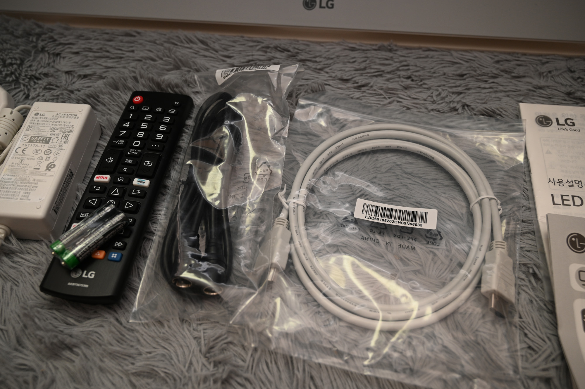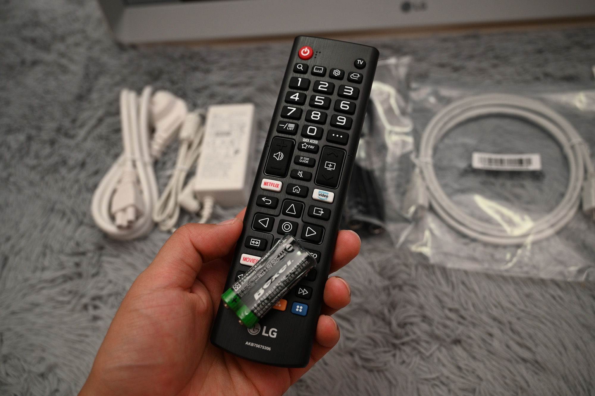 LG 일반 리모컨입니다. AAA 배터리 2개를 기본으로 제공해줍니다. 스마트 OS 탑재 모델이라 인공지능 리모컨을 쓸 수 있으나 별매입니다. 5만원인가 6만원 넘어가는 것으로 알고 있습니다.