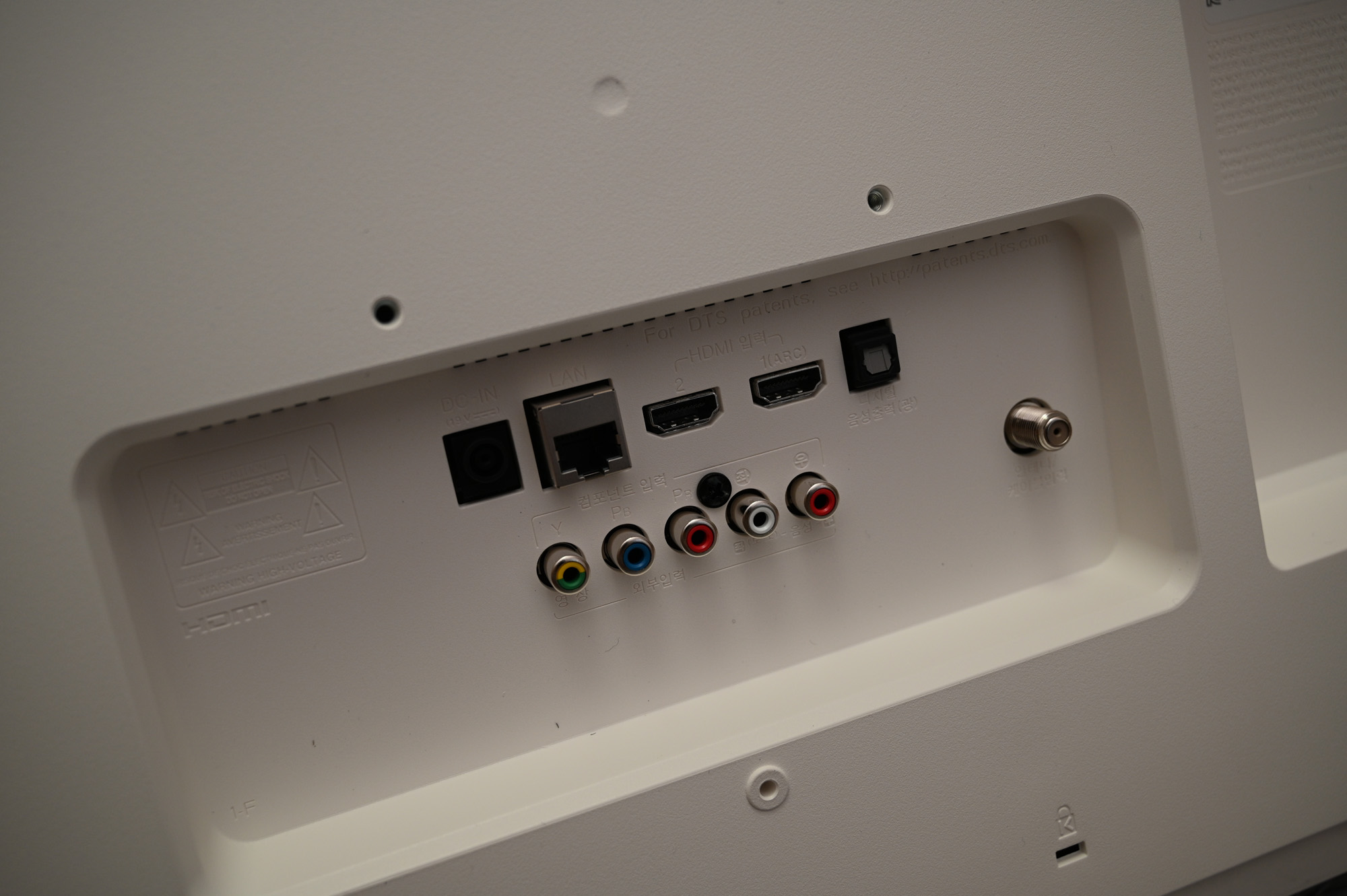 후면엔 전원 포트, 랜 포트, HDMI 포트 2개, 광 출력, 컴포넌트 외부 입력 단자 및 안테나 케이블 입력 단자가 있습니다.