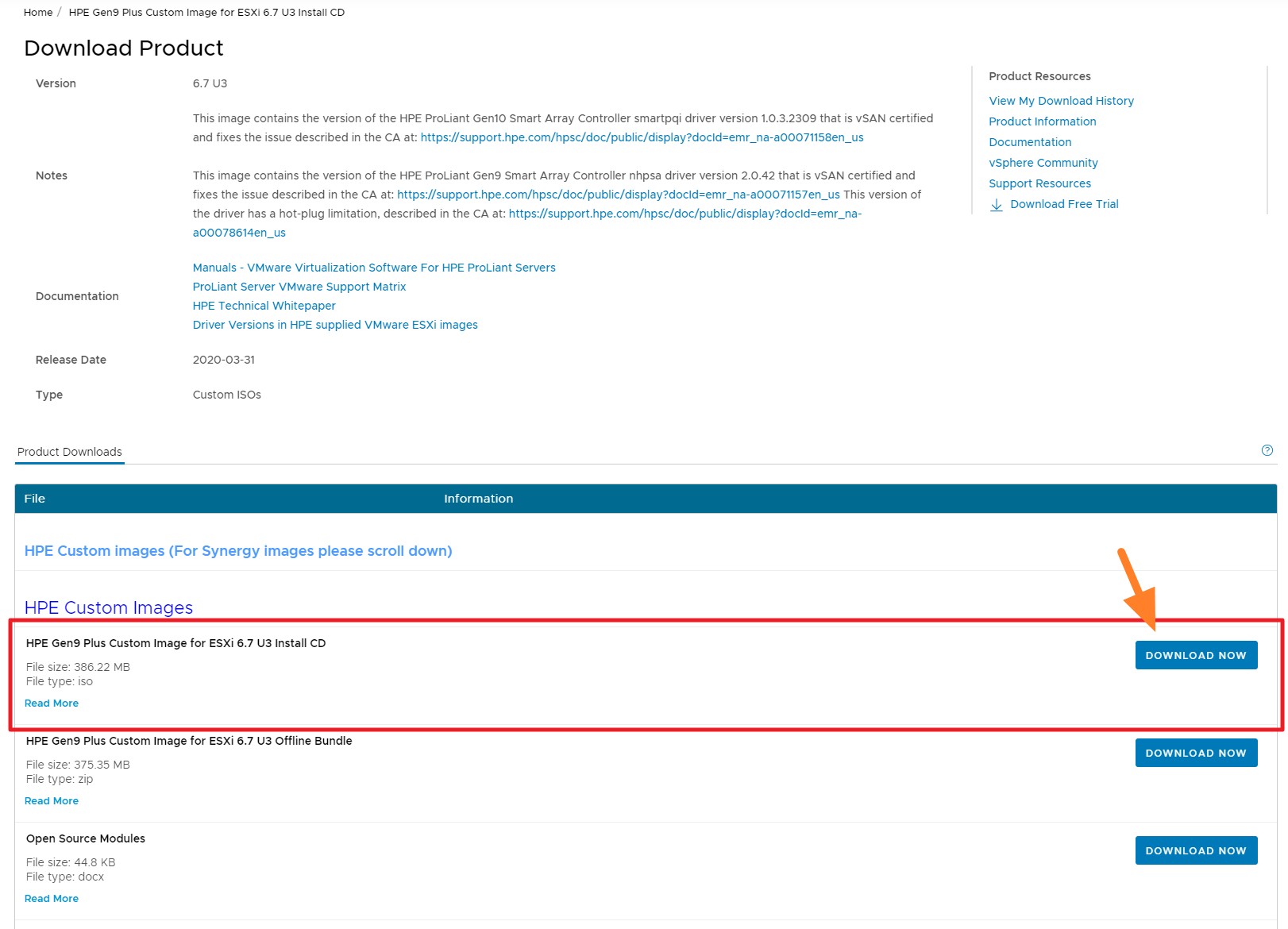 링크 접속 후 로그인을 하면 HPE Gen9 Plus 및 그 이상의 제품과 호환되는 ESXi 6.7 U3(Update 3) 이미지를 다운로드 받을 수 있습니다.