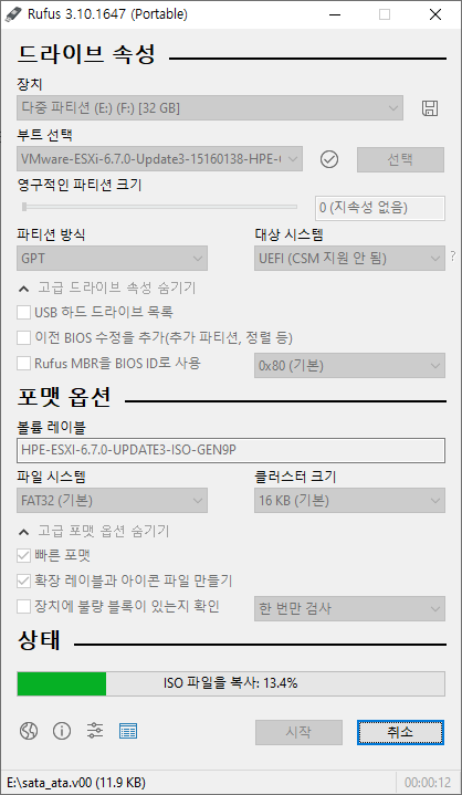 ESXi 6.7 이미지 파일이 USB 메모리로 복사되고 있습니다.