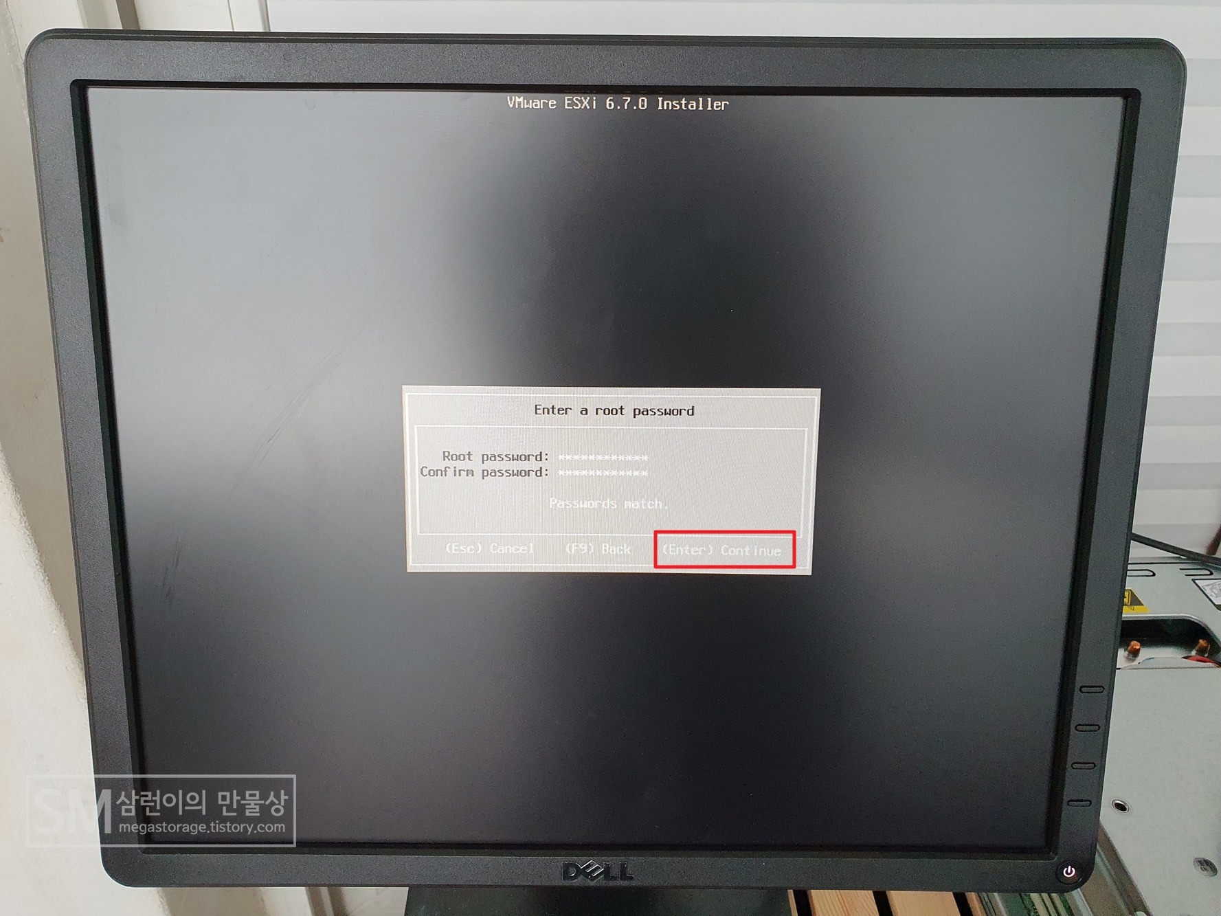 root 패스워드를 설정합니다. 입력 한 후 어디에 적어놓든 잘 기억해놔야 합니다. 까먹으면 ESXi 다시 깔아야 하거든요. root 패스워드를 입력한 후 '엔터' 키를 눌러주세요.