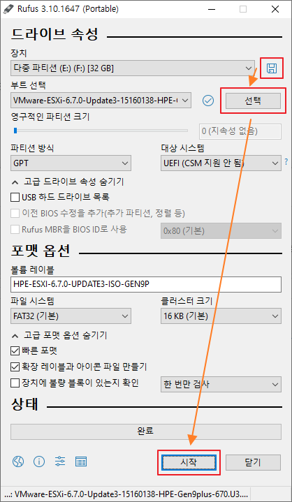 프로그램을 실행하면 위와 같은 화면이 뜹니다. 위 화면은 본문에 첨부된 3.10.1647 Portable 버전입니다. USB 메모리 선택 -> ESXi 6.7 이미지 선택 후 시작 버튼을 누르면 됩니다. 파일이 다 지워질거라는 경고창이 뜨면, 확인을 눌러서 진행합니다.