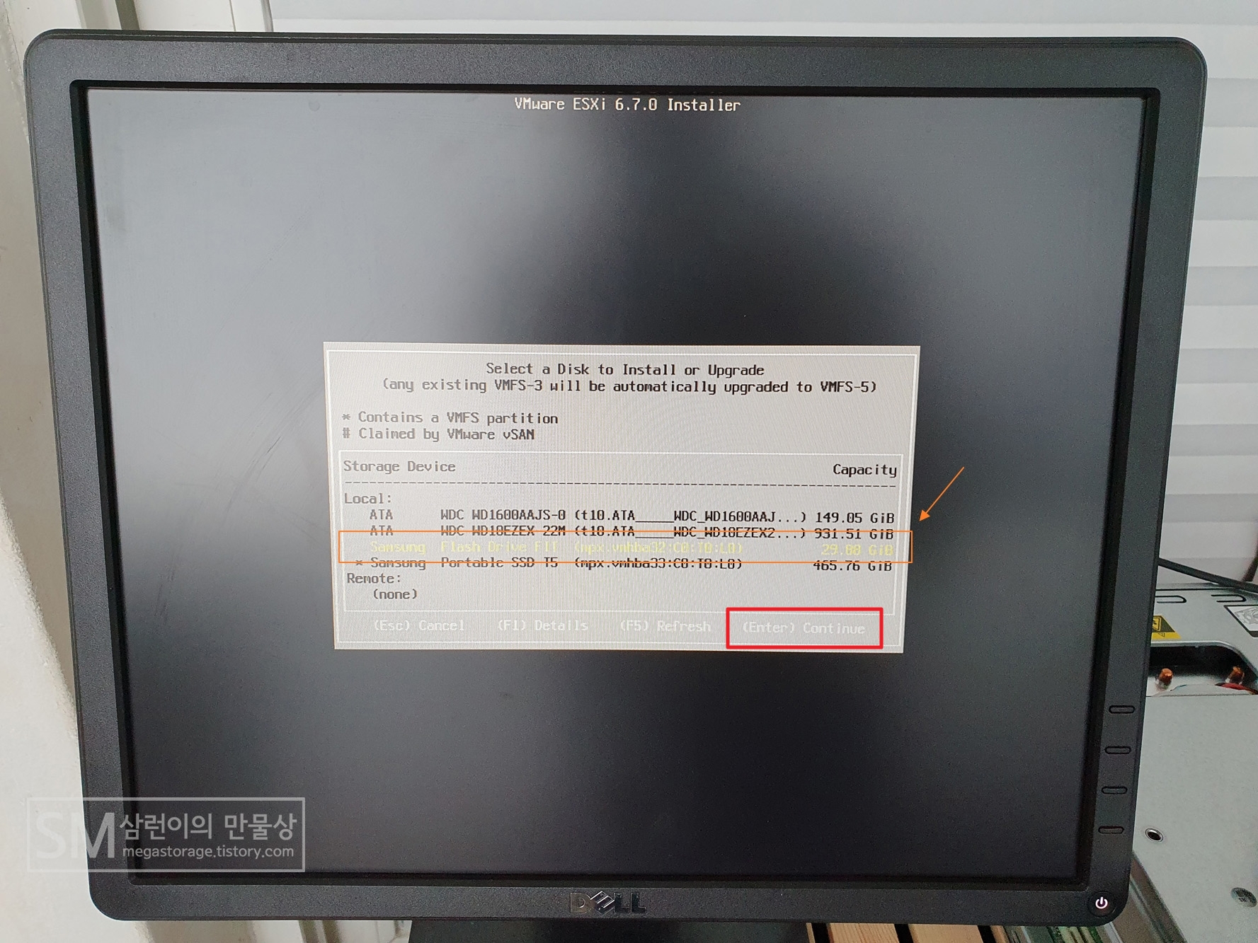 현재 시스템에 부착되어 있고 ESXi 설치가 가능한 드라이브를 보여줍니다. 저는 ESXi 설치 USB에 ESXi 6.7을 설치할 것입니다. 설치 프로그램은 이미 다 로딩된 상태라서, 동일한 USB 메모리를 선택해줘도 안전하게 잘 진행됩니다. 올바른 디스크를 선택한 후 키보드의 '엔터' 키를 눌러주세요.