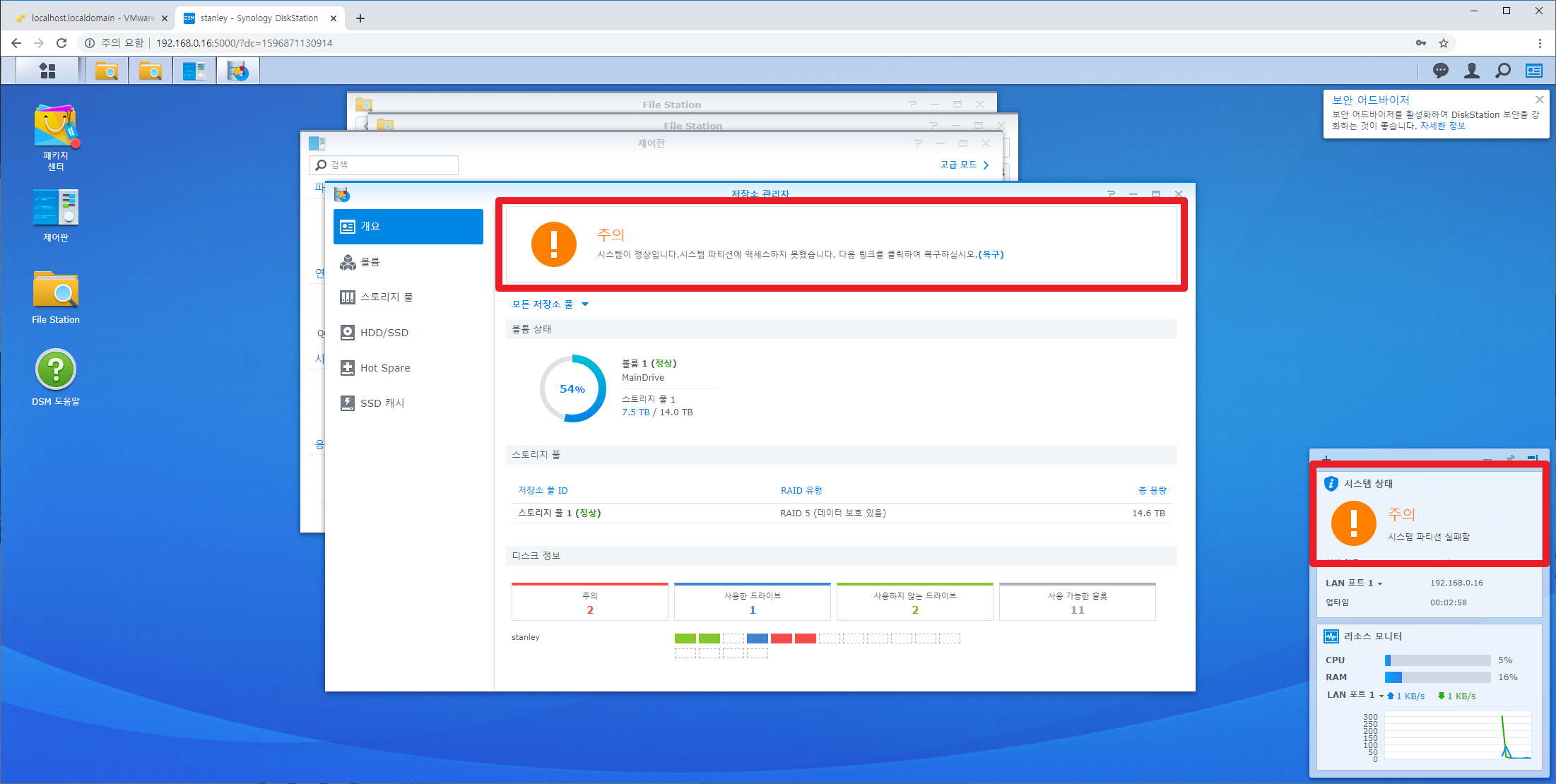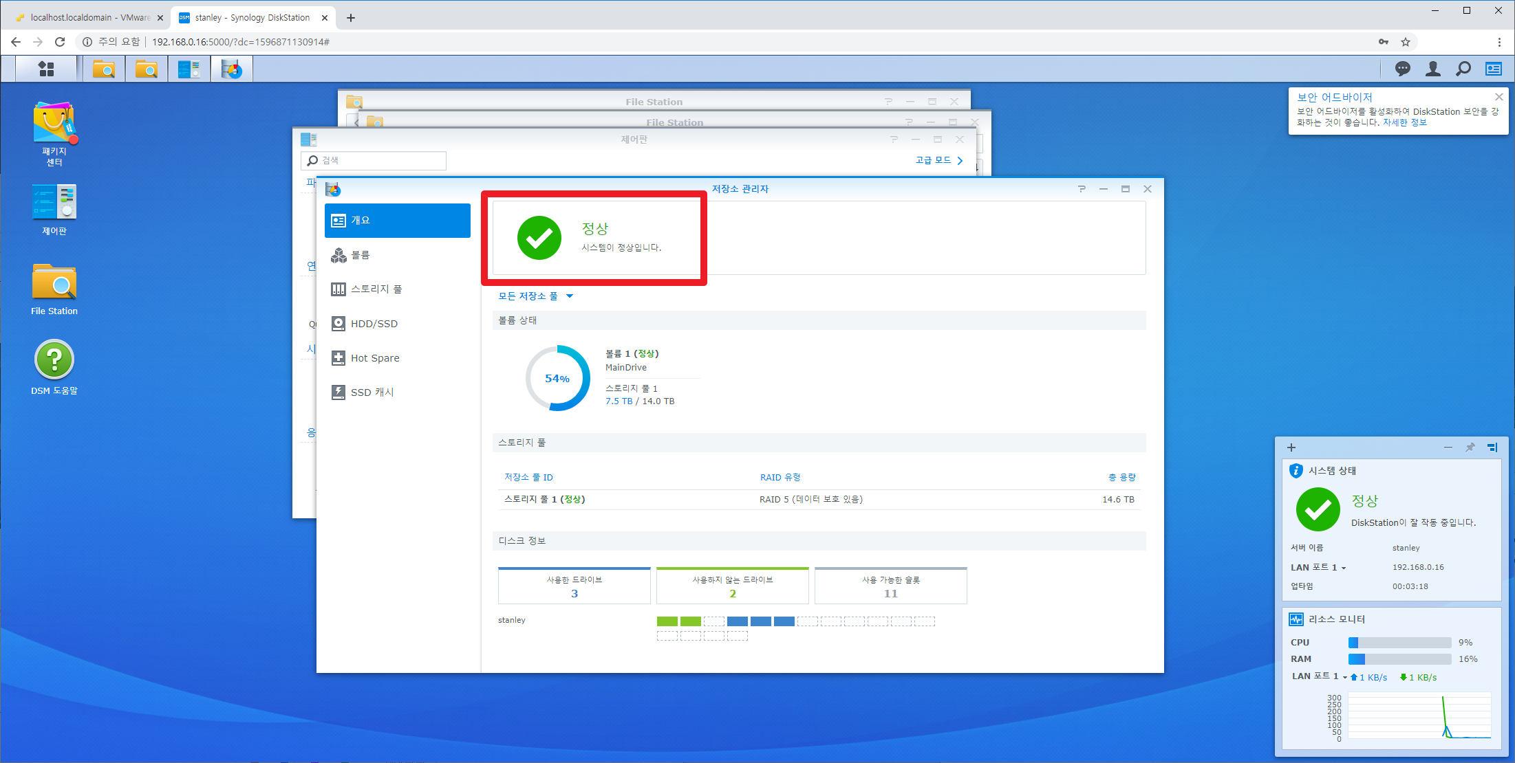 부팅이 되고나면 가장 먼저 해야 할 것은 시놀로지 디스크들이 정상적으로 인식 됐는지, RAID 구성이 올바르게 유지 되었는지 확인해야 합니다. 8TB 하드디스크 3개를 RAID5로 구성한 상태 그대로 올바르게 인식되었습니다.