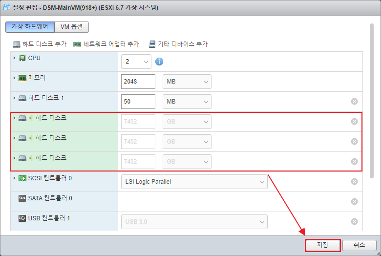 생성한 모든 RDM 디스크 파일을 선택하면 위와 같이 정상적으로 추가됩니다. 저는 3개 모두 8TB 짜리 하드디스크 였기 때문에 7,452GB로 표시됩니다. 용량이 다르면 당연히 위의 화면에서도 다른 용량으로 표시 될 것입니다.