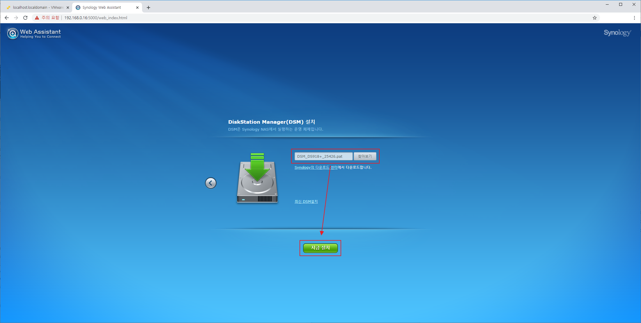 DS918+용 DSM 6.2.3-25426.pat 파일을 선택한 후 '지금 설치'를 클릭합니다.