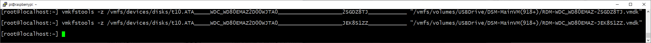 vmkfstools -z /vmfs/devices/disks/t10.ATA_____WDC_WD80EMAZ2D00WJTA0____________________2SGDZ8TJ____________ "/vmfs/volumes/USBDrive/DSM-MainVM(918+)/RDM-WDC_WD80EMAZ-2SGDZ8TJ.vmdk"