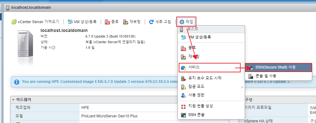 먼저 ESXi의 SSH를 사용하도록 설정해야 합니다. ESXi 메인화면에서 '작업' -> '서비스'의 'SSH(Secure Shell) 사용'을 클릭해주면 됩니다.