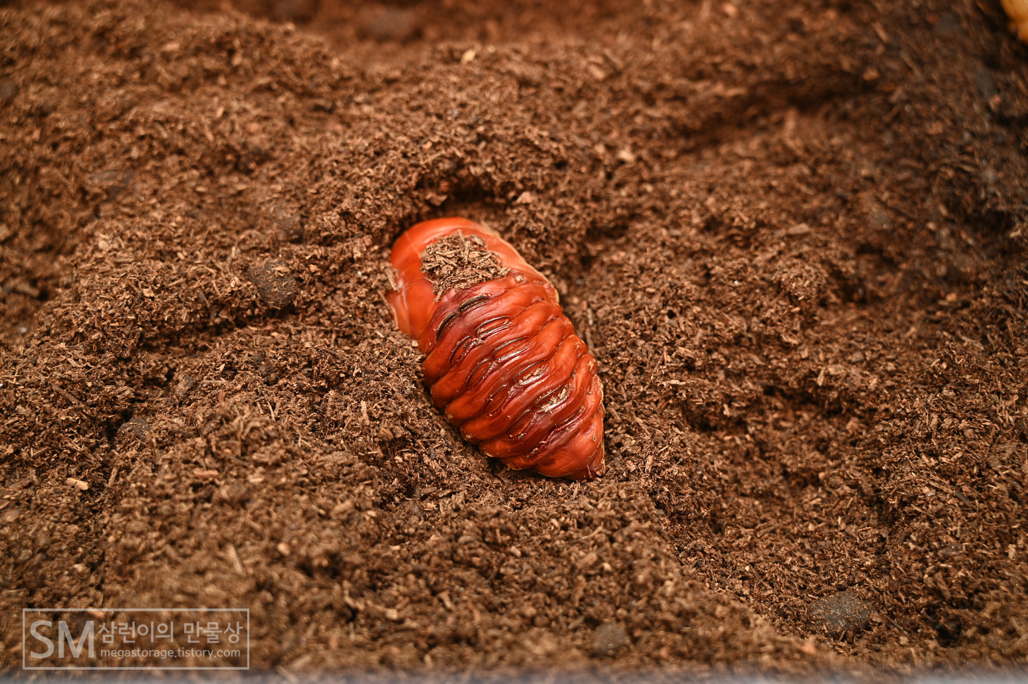 장수풍뎅이 애벌레가 번데기로 변한 후 자세(?)를 제대로 잡지 못하면 나중에 성충이 되었을때 장애를 가지고 태어날 수 있다는 글을 봤습니다. 번데기의 머리가 위를 향하는 자세가 가장 좋다고 해서 위 사진처럼 해봤습니다. 참고로 장수풍뎅이 번데기 상태에서도 꼬리 부분이 계속 움직입니다. 진짜 계속 움직입니다. 번데기가 되면 가만히 있을줄 알았는데 조금의 충격만 가해져도 계속 움직였습니다.