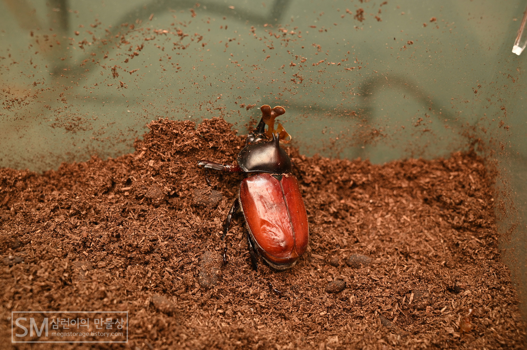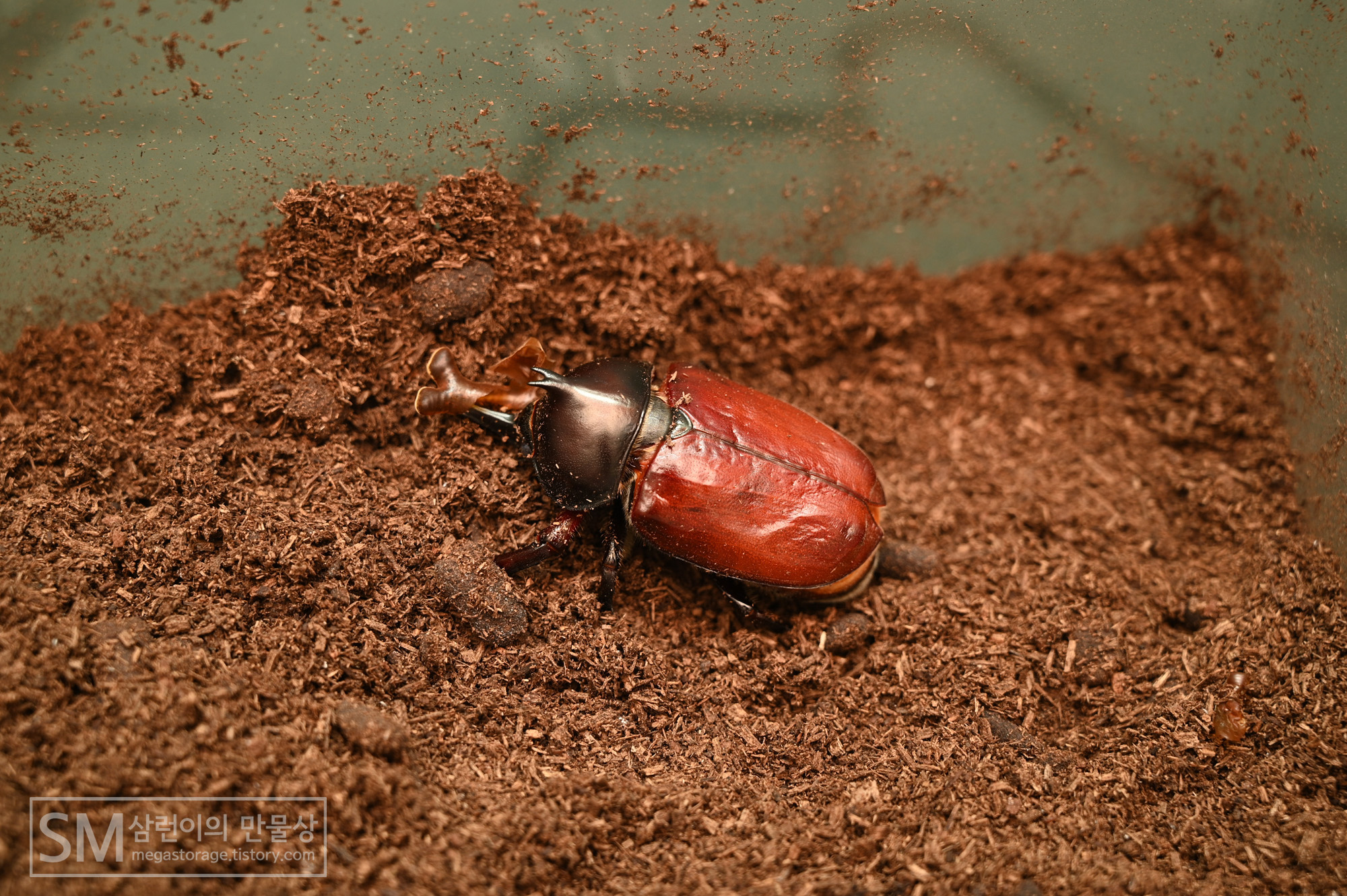뒤집어진 상태로 오랜 시간이 지나서인지, 날개가 이상하게 자리잡혔습니다. 처음엔 성충이 된지 얼마 안되어서 날개가 저런 모양일줄 알았는데..... 저 상태로 쭉 가게 됩니다. 여기저기 움직이고 톱밥 속으로 들어가다보니 날개가 손상되고.. 뭐 그렇습니다. ㅠㅠ