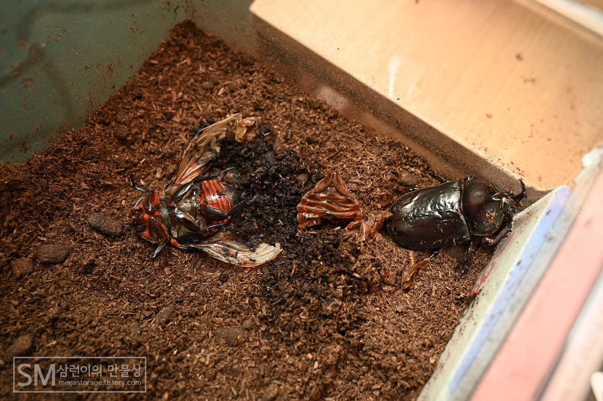 죽은줄 알았던 세번째 장수풍뎅이 성충이 나타났습니다. 분명히... 애벌레 머리만 있어서 죽은줄 알았는데...? 번데기로 변할땐 애벌레 머리만 덜렁 남기도 하나봅니다. 근데 얘도 뒤집어진 상태로 번데기에서 벗어났네요. 날개가 펴진 상태로....?