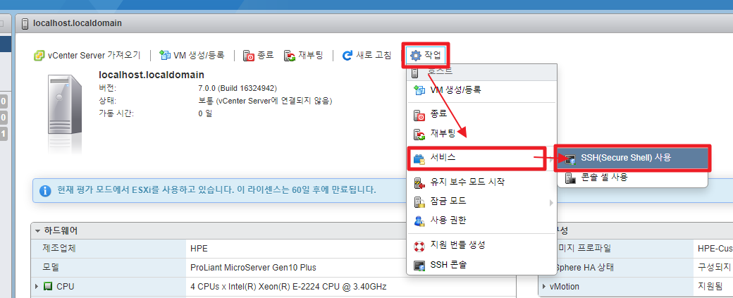 먼저 SSH 기능을 활성화합니다. PuTTY를 사용해서 접속했습니다. 작업 당시 ESXi 환경은 7.0.0이었는데, 6.7과 아주 유사하므로, 6.7 사용자분들도 똑같이 따라하시면 됩니다.