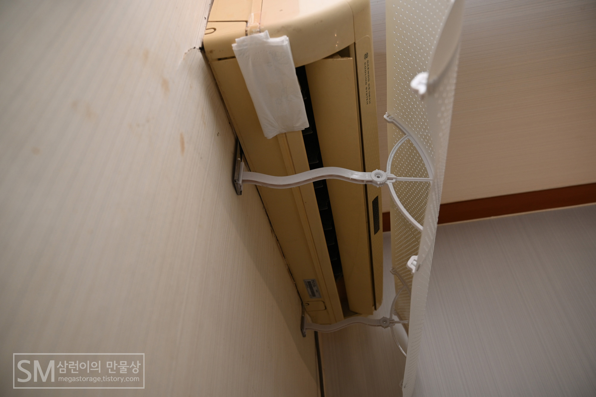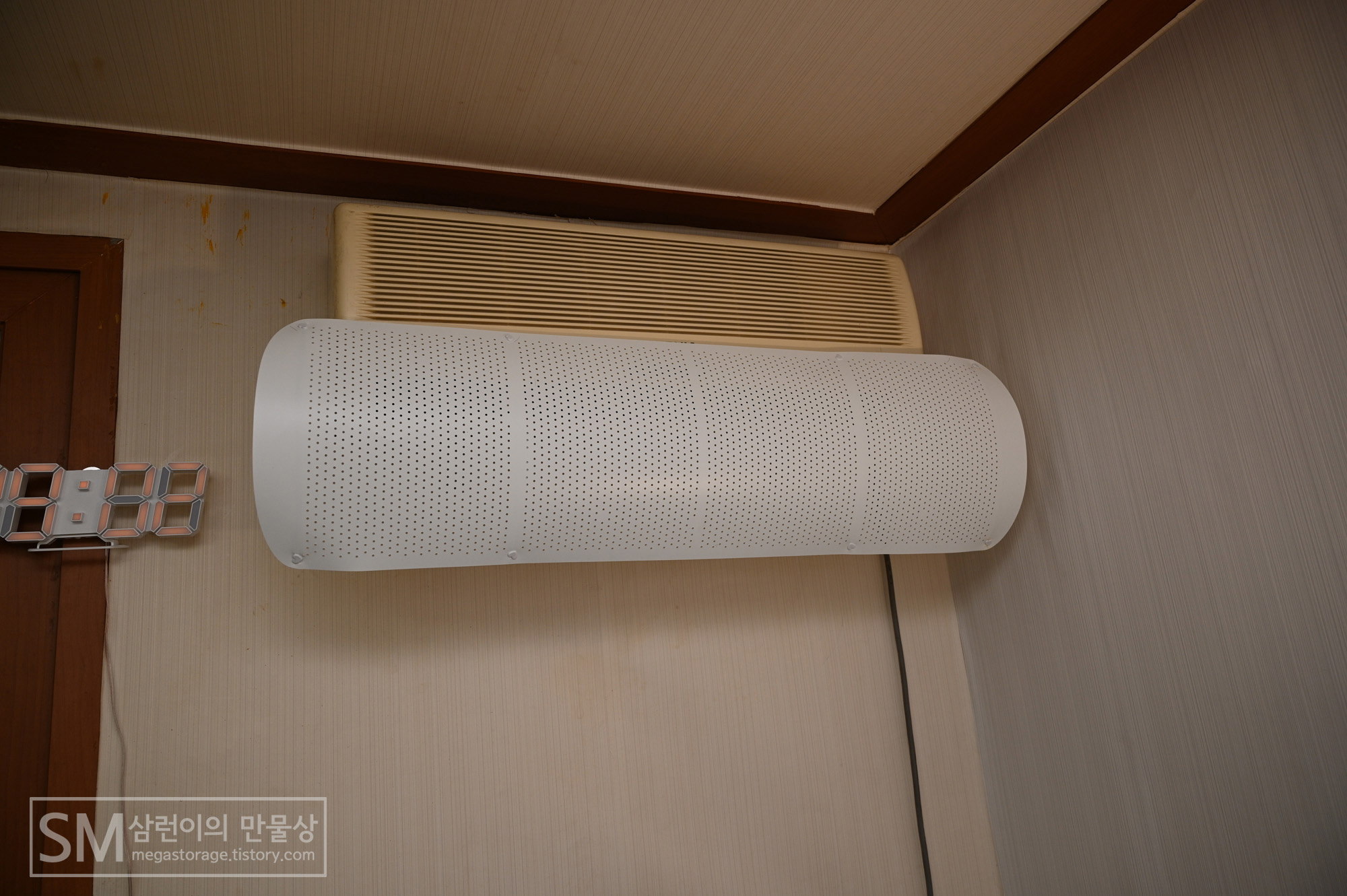 에어컨 걸이 자체를 장착하지 못했다면 본문의 제품이 아닌, 에어컨 양쪽에 양면테이프로 부착하는 방식의 에어컨 바람막이를 구입하셔야 합니다.