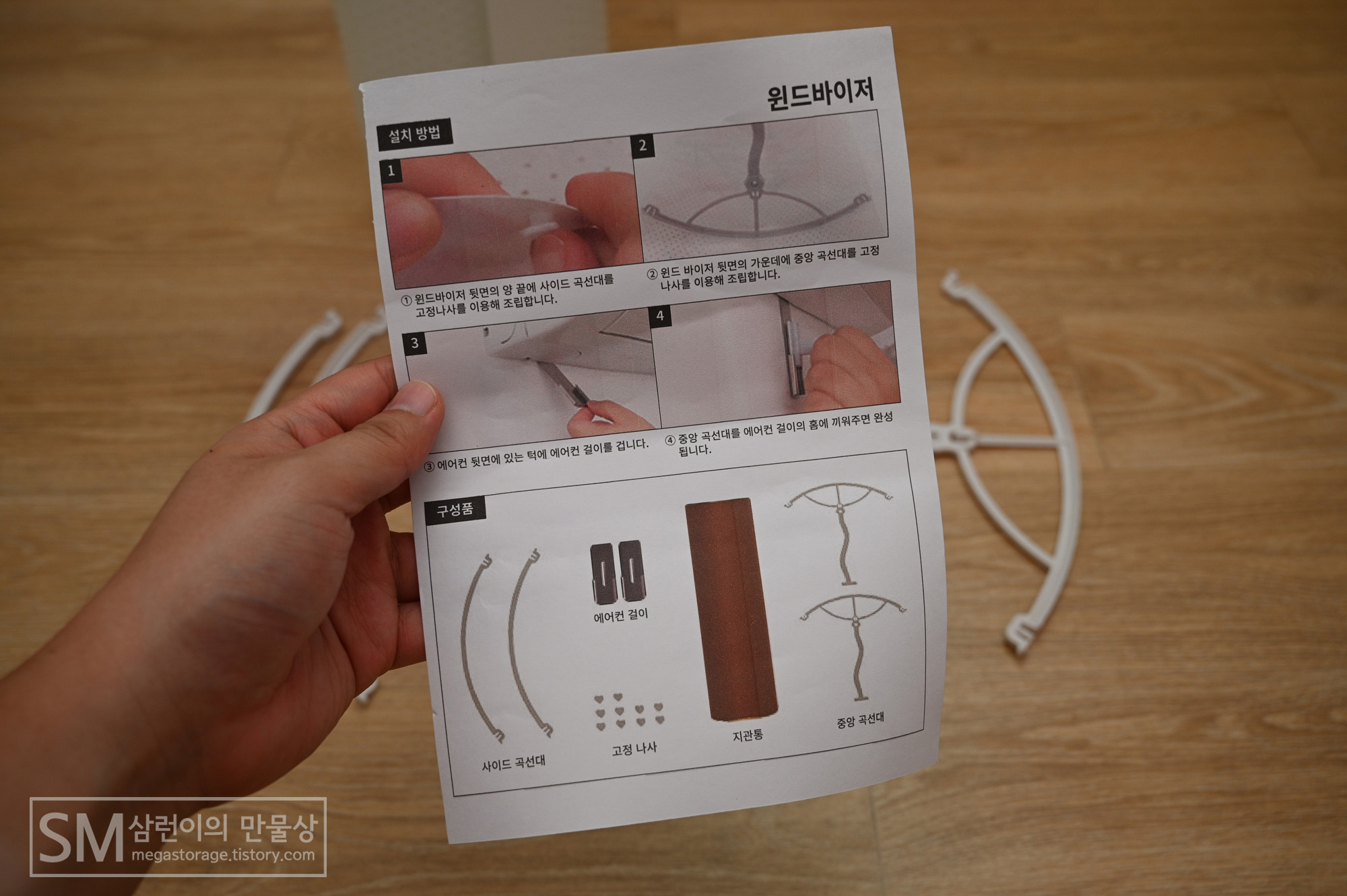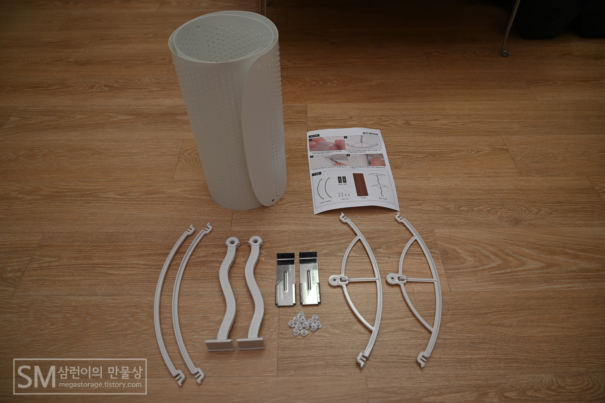전체 구성품입니다. 바람막이 본체, 사용 설명서, 가이드 및 그 외 부품들입니다.