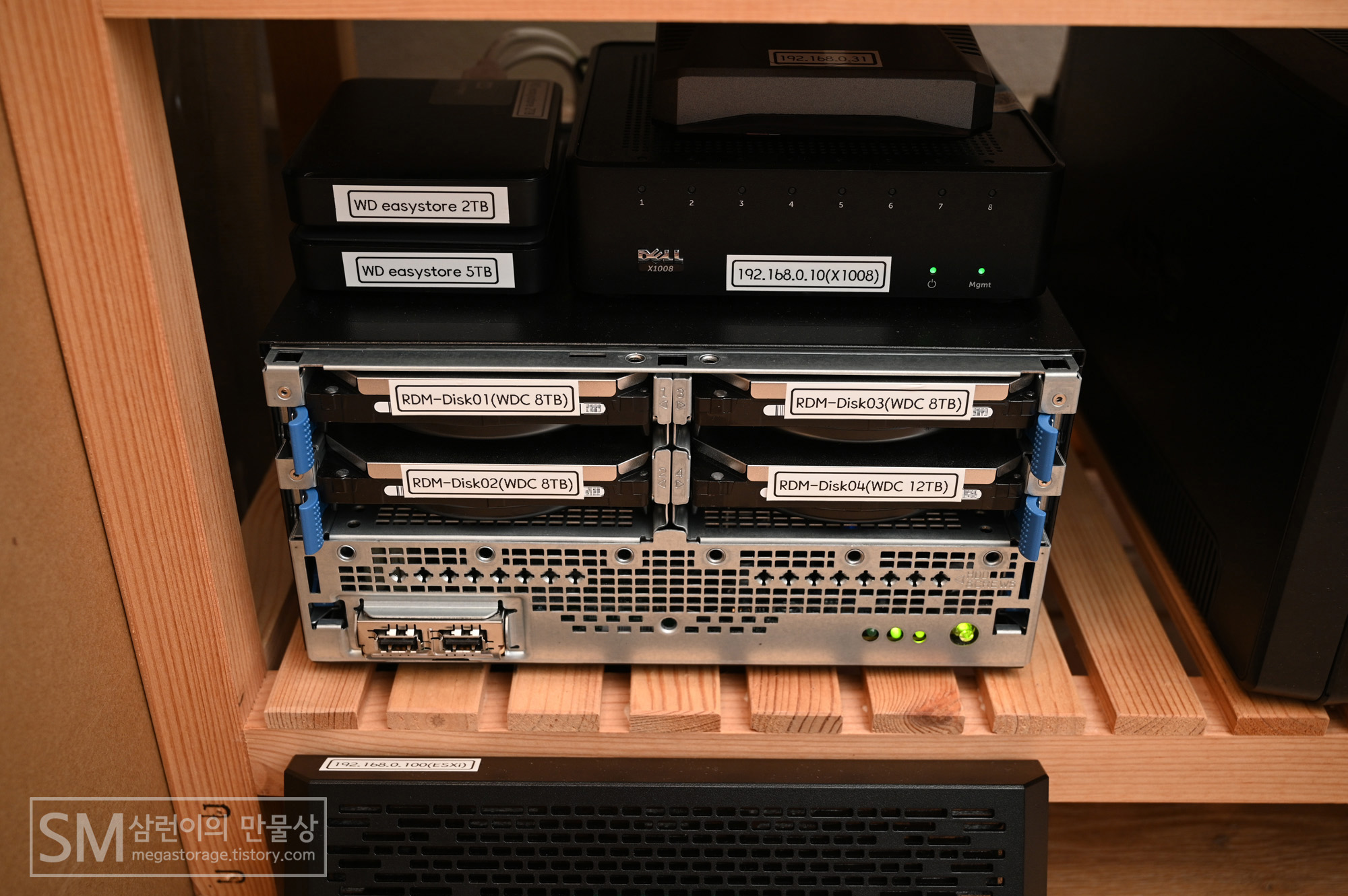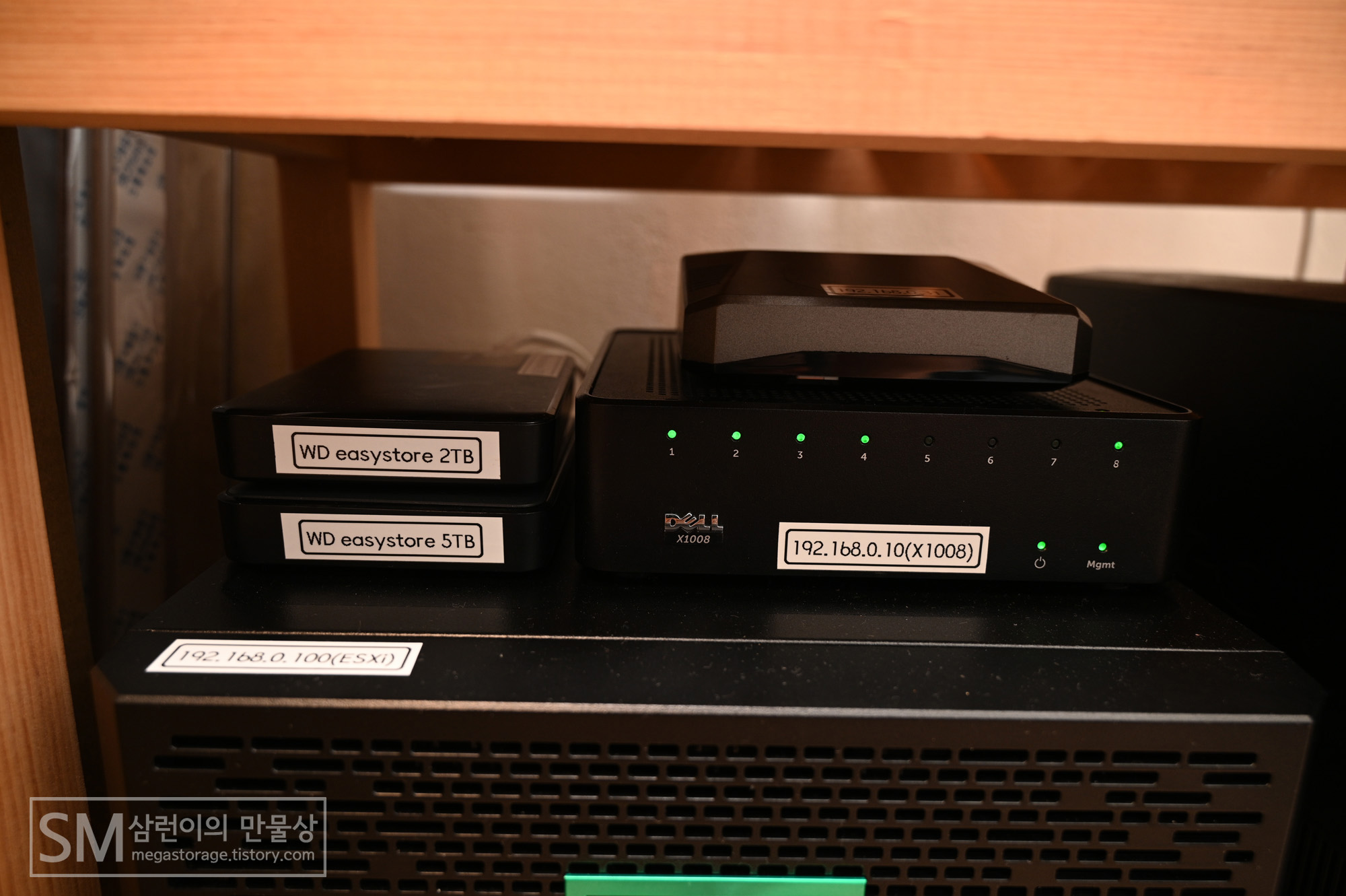 우측엔 Dell X1008 스위칭 허브가 있습니다. 기존엔 5포트 스위칭 허브와 10Gbe 지원되는 20만원짜리 Cisco 스위칭 허브를 사용했었는데, 순수하게 이 녀석이 야간에 예뻐서 구입했습니다. 근데 성능도 꽤 만족스러워서 불만 없이 지금까지 쭉 사용 중입니다.