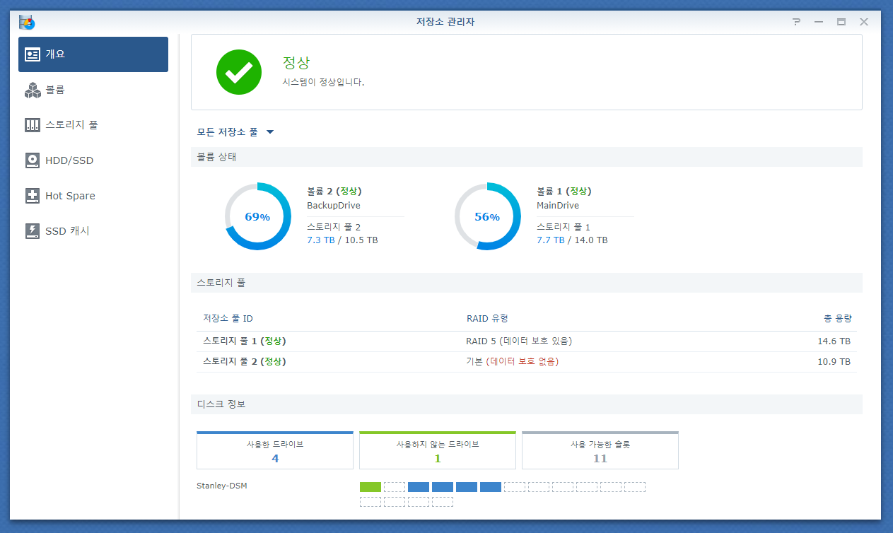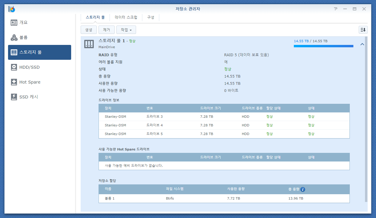 - 메인 디스크 : WDC 8TB * 3EA (시놀로지OS RAID5)