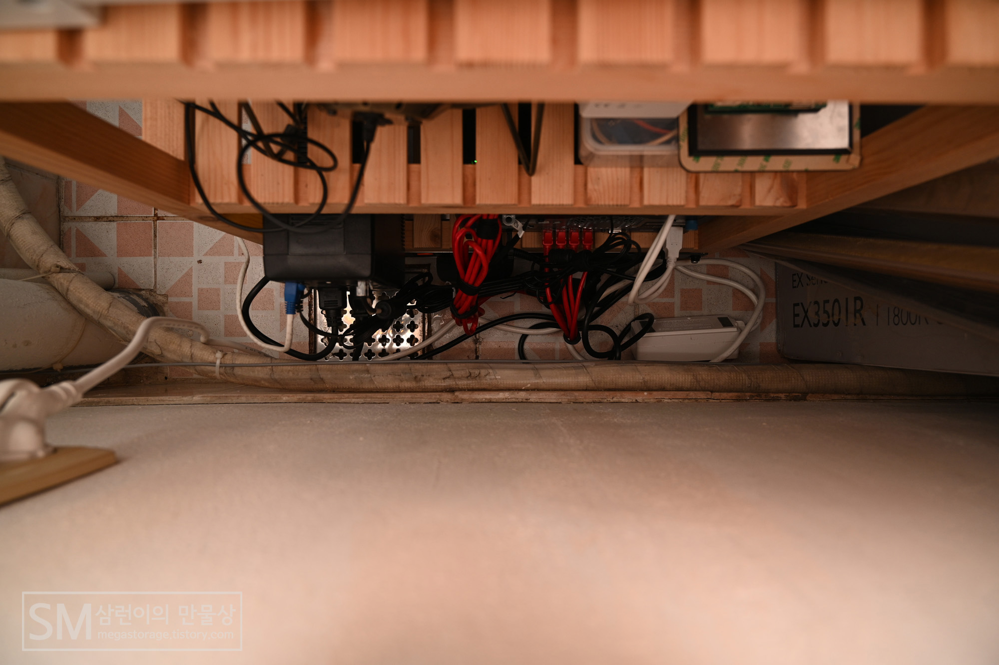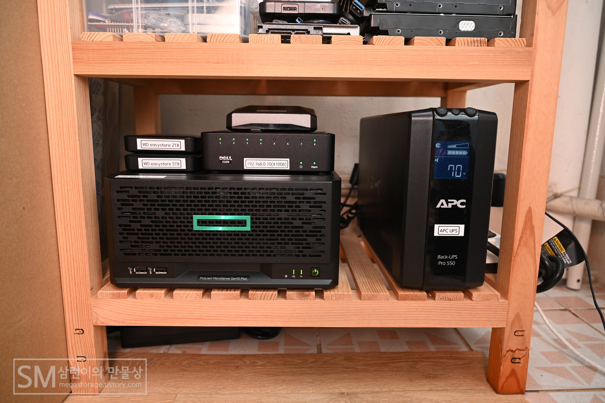 2층엔 잡동사니들이 있고 1층엔 서버, 백업용 외장하드들, 스위칭 허브, 라즈베리 파이4(스위칭 허브 위쪽) 및 UPS가 있습니다. UPS는 정말 보험과도 같은 존재입니다. 소중한 자료가 있는 서버를 24시간 구동한다면, UPS를 꼭 설치하세요. 꼭이요.