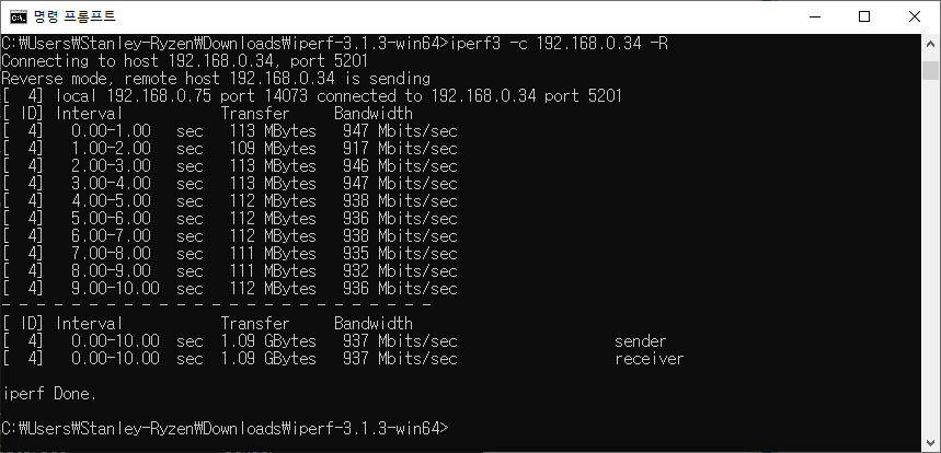 윈도우10 가상 이미지에서 iPerf3 서버 구동 후 데스크탑 PC에서 네트워크 Thorughput 성능 측정을 해보니, 약 1Gbe 속도로 뽑아내주고 있습니다.