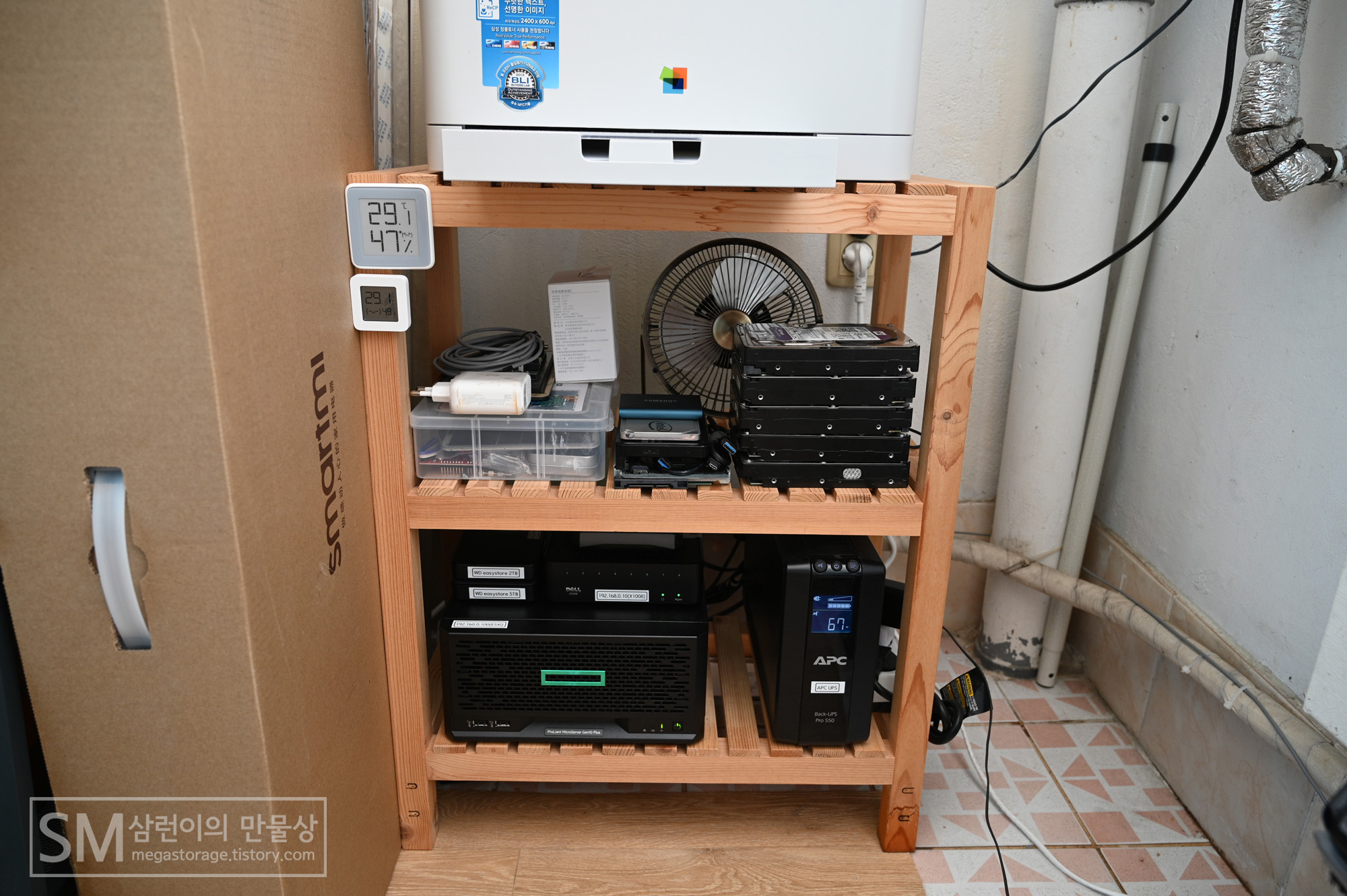 현재 살고 있는 집의 베란다에 설치해놨습니다. 방 안에 설치해놓으면 온도와 습도로부터 관리가 매우 용이해지겠지만, 하드디스크의 헤드가 움직이는 소음은 제가 잠을 잘 못들게 해주는 큰 원인이 됩니다. 그래서 베란다로 빼놨습니다.