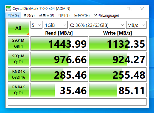 윈도우10 가상 이미지에서 io-Throughput을 CrystalDiskMark으로 테스트 해보니, ioDrive2 785GB의 스펙상 속도를 최대로 뽑아주고 있습니다.