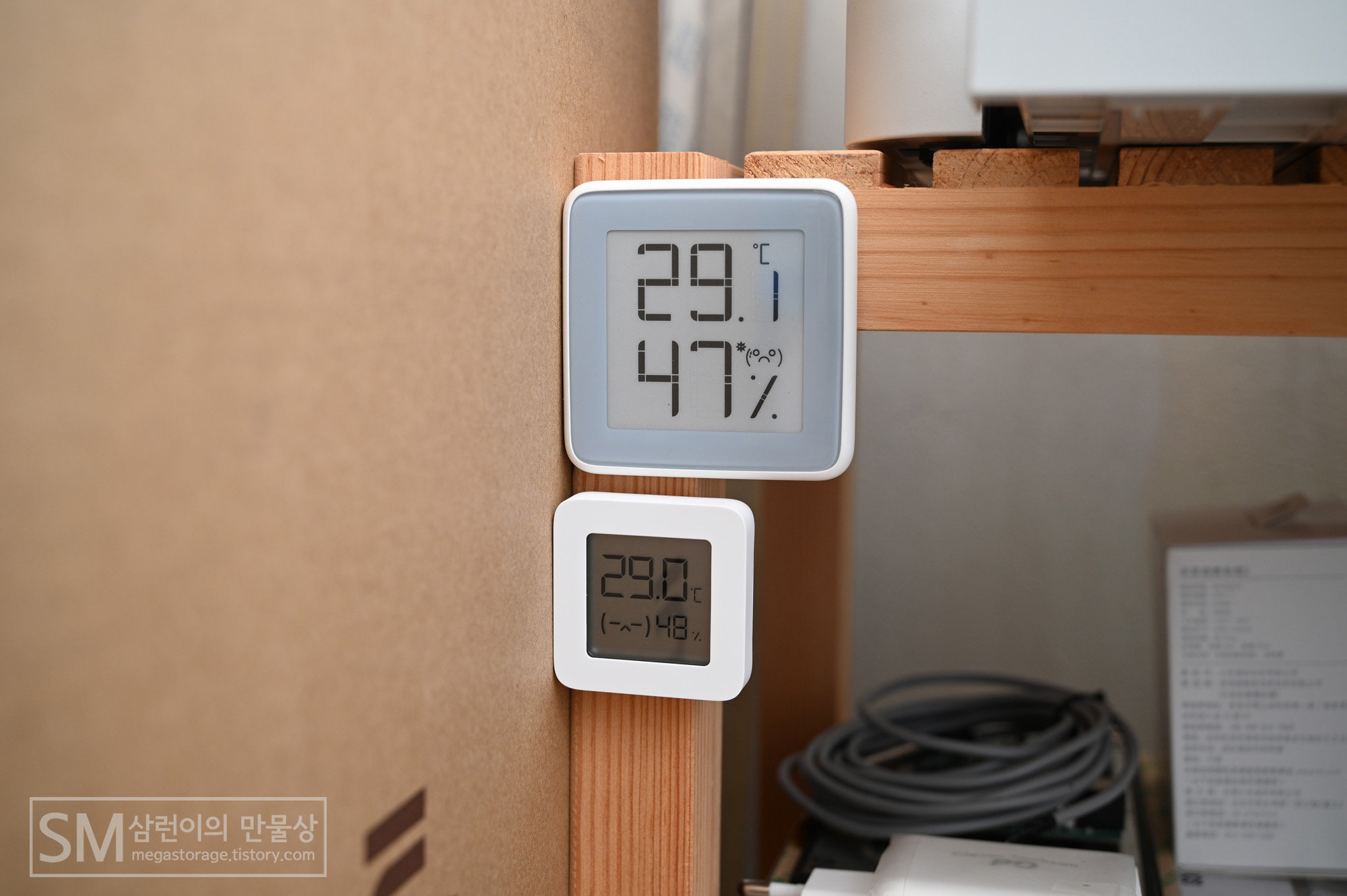 위쪽 온도계는 샤오미 전자잉크 온도계이며, 아래쪽은 샤오미 블루투스 연동 온도계입니다. 블루투스 연동 온도계는 '샤오미 게이트웨이'와 서로 연결되어 바깥 어디에서나 온도와 습도를 확인할 수 있습니다.