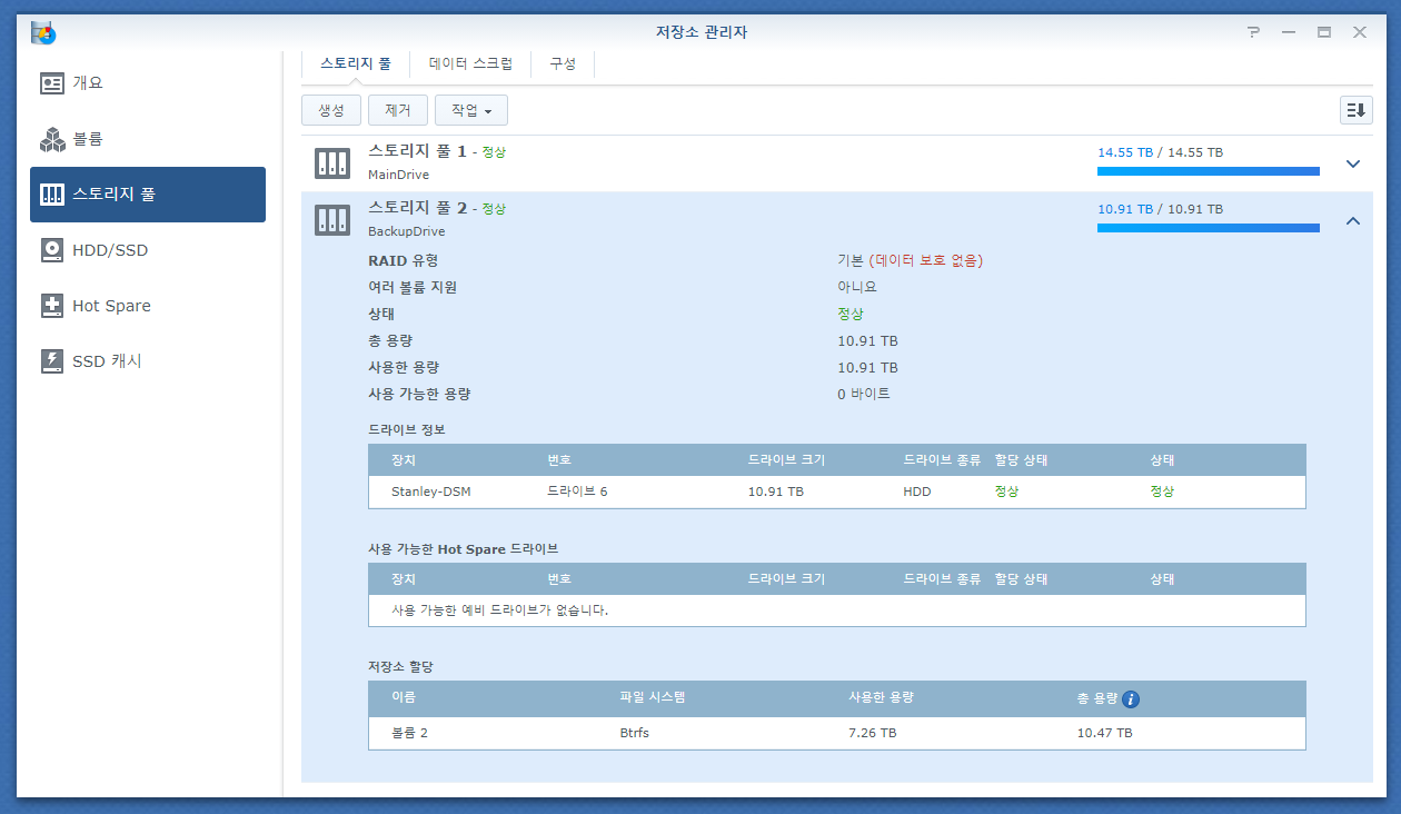 12TB 하드디스크는 단일로 동작합니다. 순수 백업으로만 동작합니다.